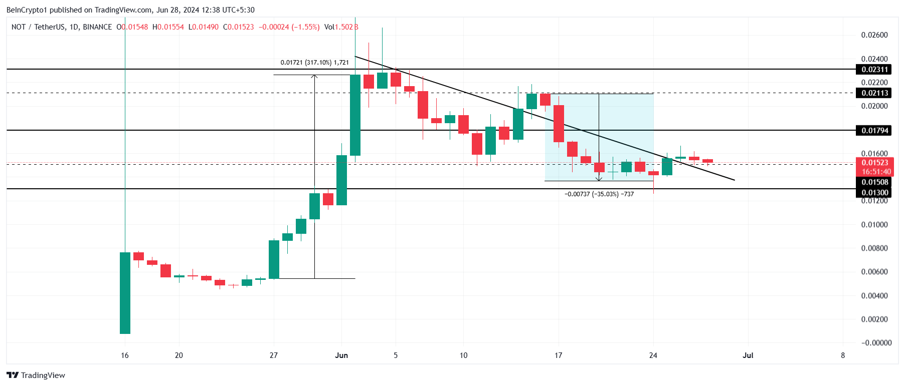 Sponsored SponsoredObwohl die letzten Tage für den Altcoin nicht sehr fruchtbar waren, gelang es NOT, diese Woche die Abwärtstrendlinie zu durchbrechen. Wenn dies anhält, könnte der Altcoin beginnen, die verlorenen Gewinne zurückzugewinnen, indem er von einem Handelspreis von 0,015 USD auf 0,020 USD steigt.