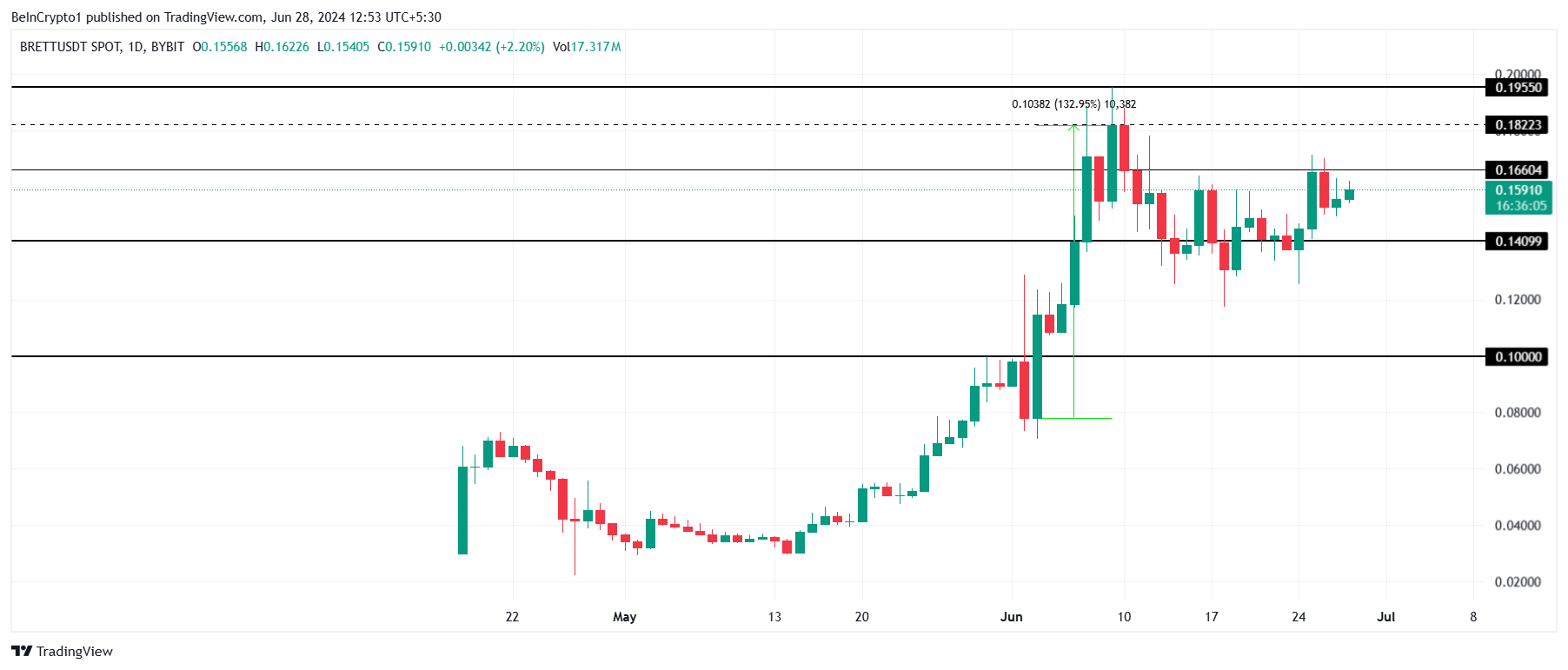 Das Allzeithoch für BRETT liegt bei 0,195 USD, und der Memecoin könnte diesen Kurs überschreiten. Angesichts der immer noch hohen Begeisterung und Nachfrage nach der Altcoin könnte sie davon profitieren.