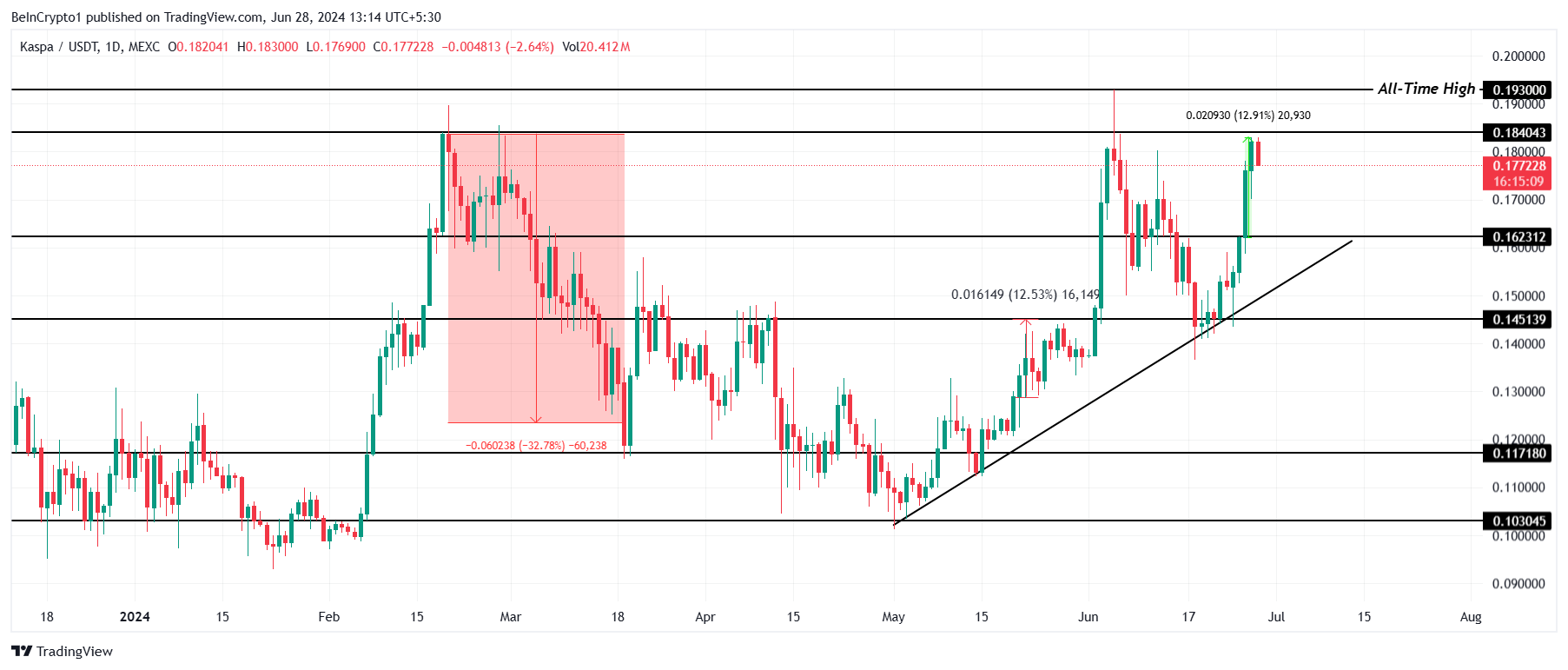 Das aktuelle Allzeithoch liegt bei 0,193 USD, und um es zu durchbrechen, müsste der Kurs von Kaspa zunächst 0,184 USD überwinden. Wenn es gelingt, dies in eine Unterstützung umzuwandeln, würde KAS den notwendigen Schub erhalten, um ein neues ATH zu etablieren.