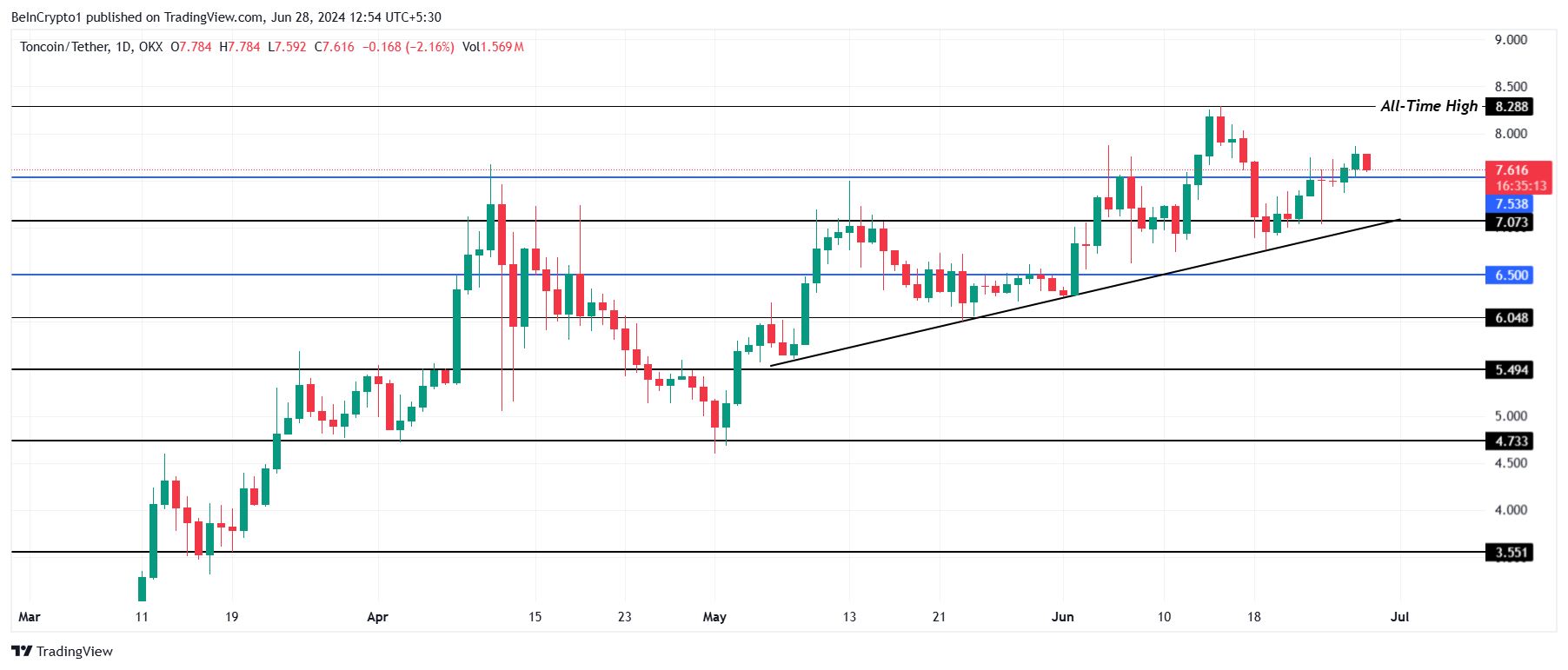 Mit einem Handelskurs von 7,6 USD könnte TON einen Schritt machen, um das bestehende Allzeithoch von 8,2 USD zu überwinden und darüber hinaus auf über 8,5 USD zu steigen. Die bestehende Aufwärtstrendlinie wurde konsequent getestet und bleibt bis heute ununterbrochen, was sie als Unterstützungsboden festigt.