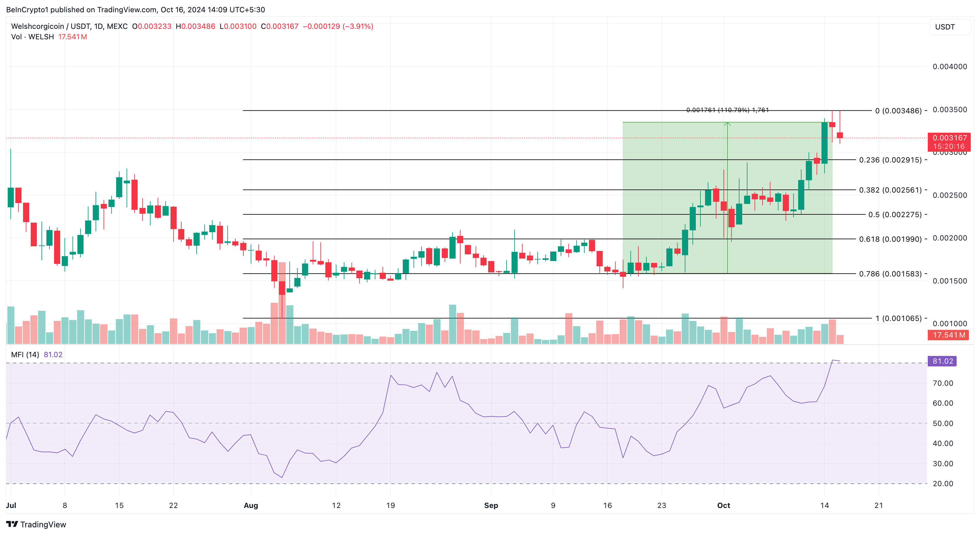 Derzeit liegt der Kurs von WELSH bei 0,0033 USD, und seine selbst berichtete Marktkapitalisierung beträgt 31,55 Millionen USD. Der Altcoin erlebte eine bedeutende Rallye und stieg zwischen dem 18. September und Montag, dem 14. September, um 110 Prozent. Jedoch hat er in den letzten 24 Stunden 2 Prozent dieser Gewinne wieder verloren.