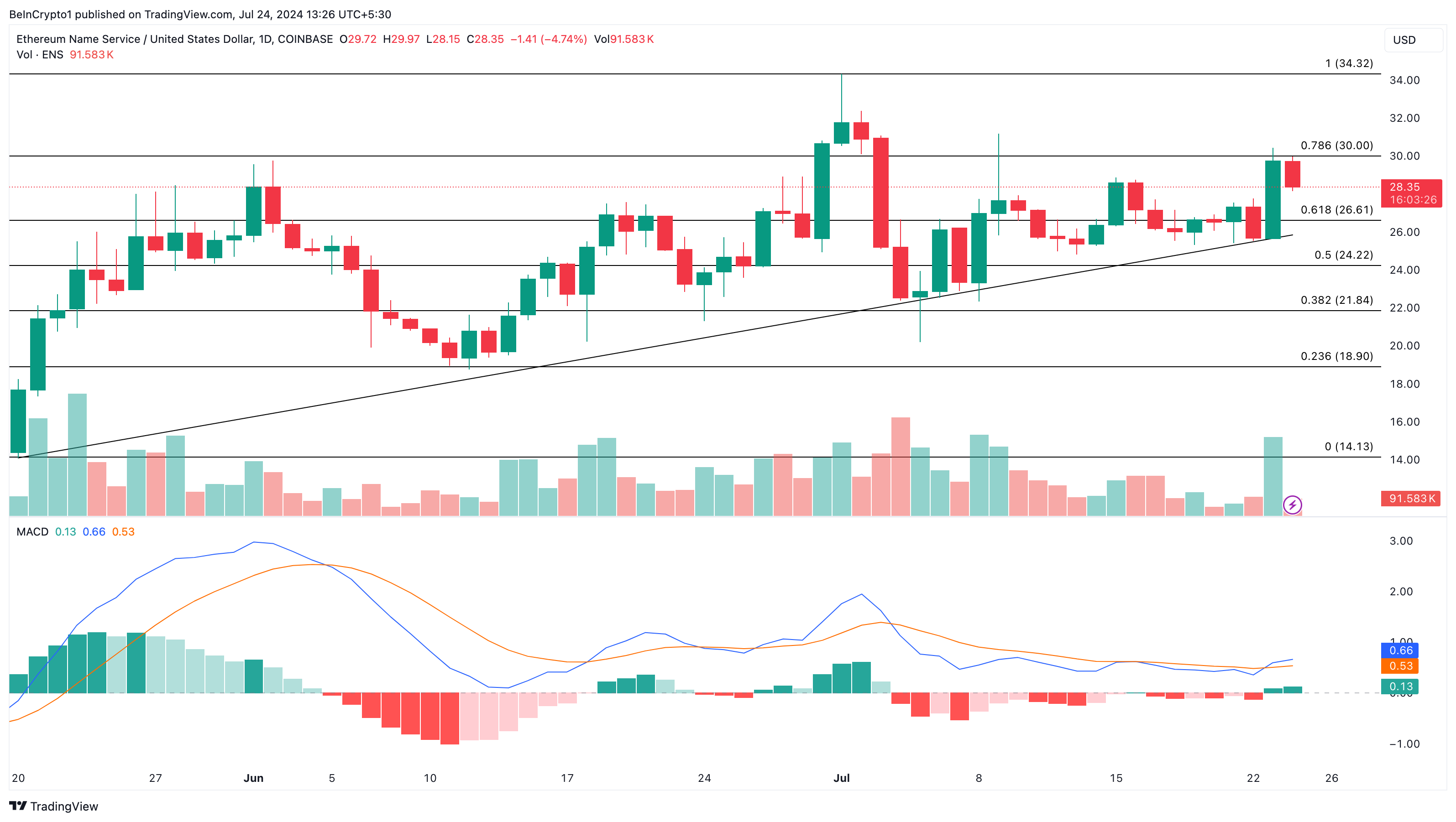 Zuvor berichteten wir, dass ENS Anzeichen zeigte, was mit der Genehmigung der Spot Ethereum ETFs möglich sein könnte. Kurz darauf erreichte der Kurs der Kryptowährung unsere Vorhersage von etwa 28,35 USD.