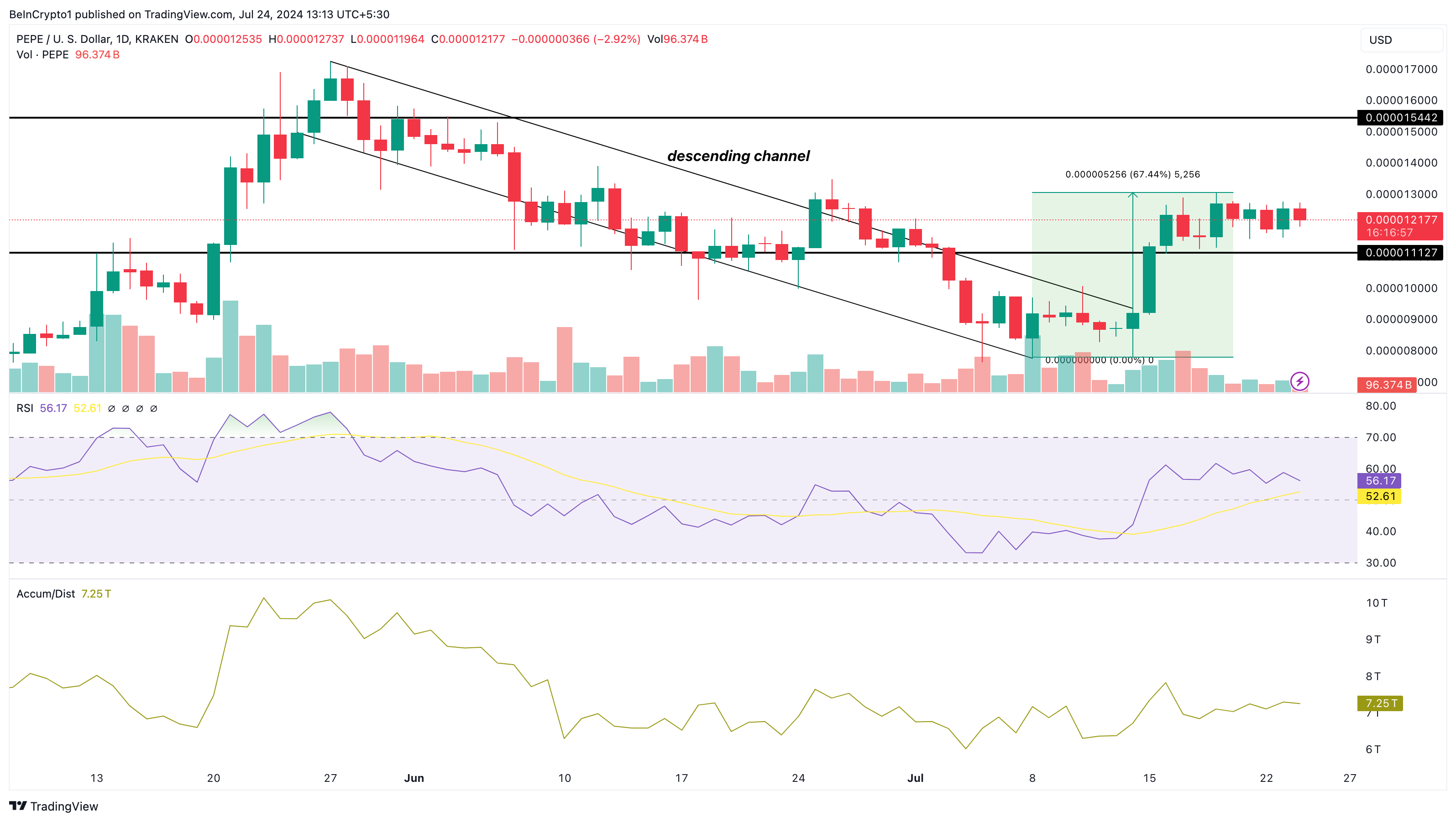 PEPE ist kürzlich aus einem absteigenden Kanalmuster ausgebrochen. Dieses Muster zeigt einen Abwärtstrend, mit spezifischen Widerstands- und Unterstützungsniveaus an der oberen und unteren Trendlinie.
