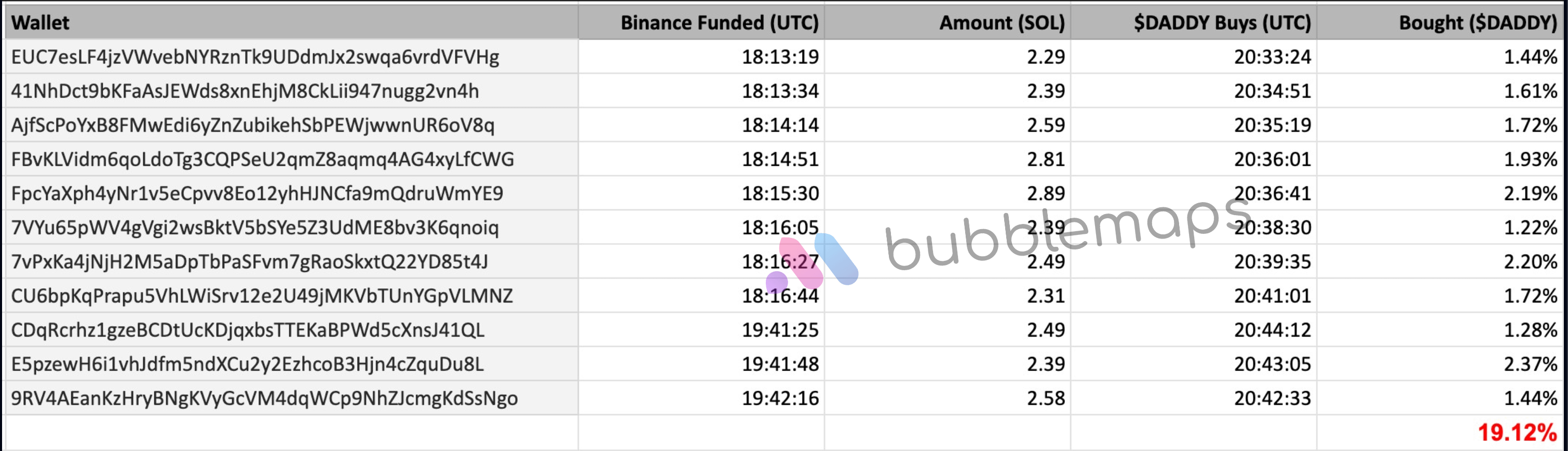 Obwohl er behauptete, keine Tokens verkauft zu haben, tauchten andere fragwürdige Transaktionen auf. Laut Bubblemaps kauften 11 Wallets, die fast gleichzeitig über Binance mit nahezu identischen Beträgen finanziert wurden, 20 Prozent von DADDY am 9. Juni, bevor der erste Tweet von DaddyTateCTO erschien.