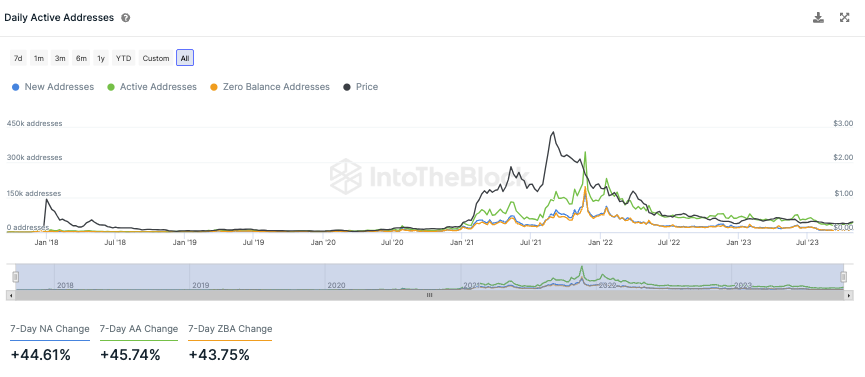Die Anzahl an aktiven Adressen ist in den letzten sieben Tagen um rund 45,7 % gestiegen. Die Anzahl an neuen Cardano Adressen ist dabei um rund 44,61 % gestiegen, wohingegen die Anzahl an Adressen ohne ADA Guthaben in derselben Zeit um rund 43,75 % angestiegen ist.