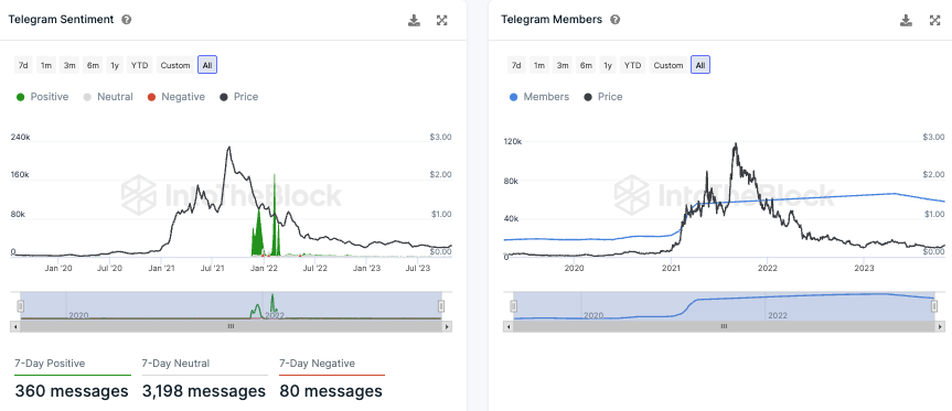 Auf Telegram ist die Stimmung zu Cardano überwiegend positiv. In den letzten sieben Tagen lagen rund 360 positive und 80 negative Nachrichten vor. Die Anzahl an Mitgliedern der Cardano Telegram Gruppe ist dabei aber deutlich gesunken. Seit Mitte des Jahres liegt ein starker Abwärtstrend vor.