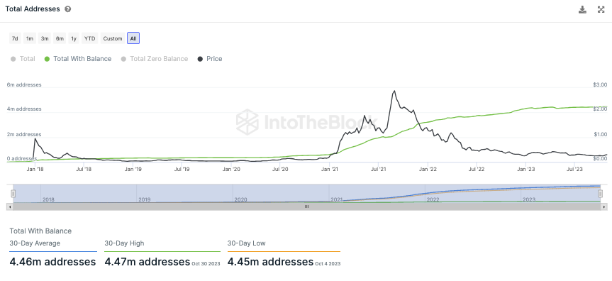 Die Gesamtanzahl an ADA Adressen im Cardano Netzwerk befindet sich nur noch in einem ganz leichten Aufwärtstrend. In den letzten 30 Tagen wurden durchschnittlich rund 4,46 Millionen Adressen mit ADA Guthaben gezählt. An dieser Zahl hat sich seit Wochen nicht mehr viel geändert.