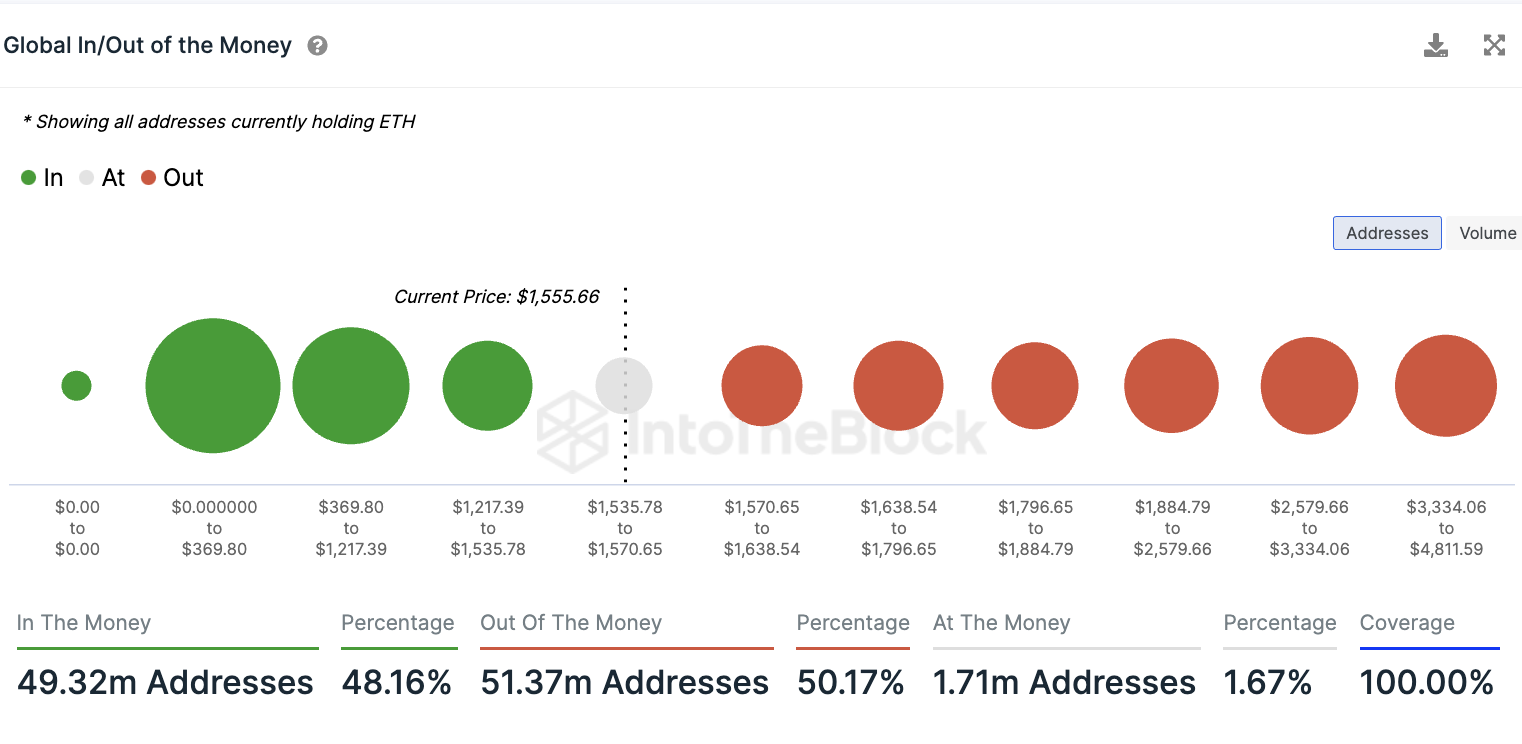 Mittlerweile sind mehr als die Hälfte der Ethereum Adressen im Minus. Rund 48 % sind dabei noch im Plus, wohingegen rund 1,7 % am Break-even Punkt sind.