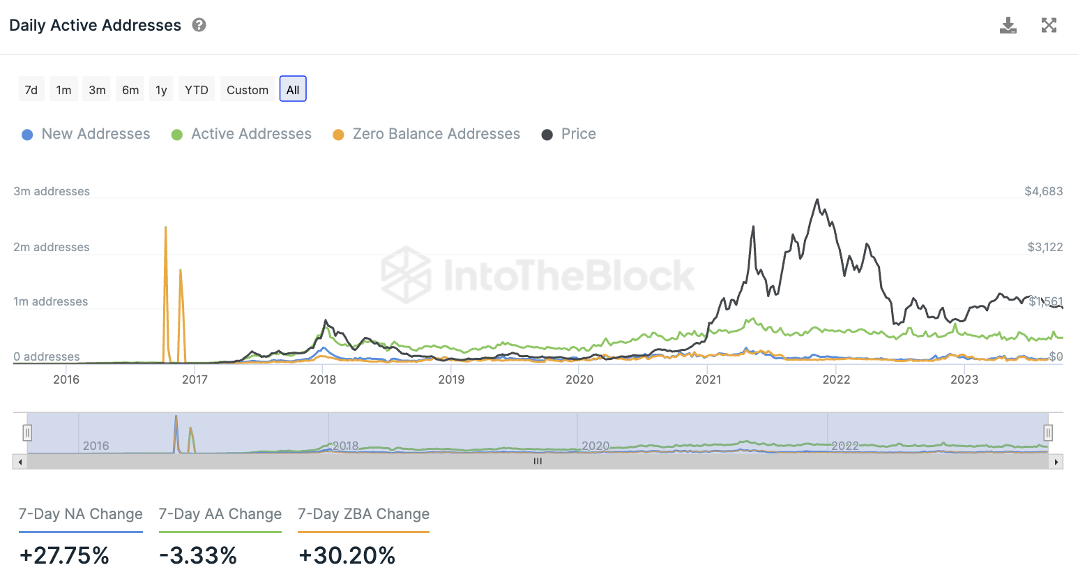 Die Aktivität im Ethereum Netzwerk hat hingegen abgenommen. Denn die Anzahl an aktiven ETH Adressen hat in den letzten sieben Tagen um rund 3,33 % abgenommen.