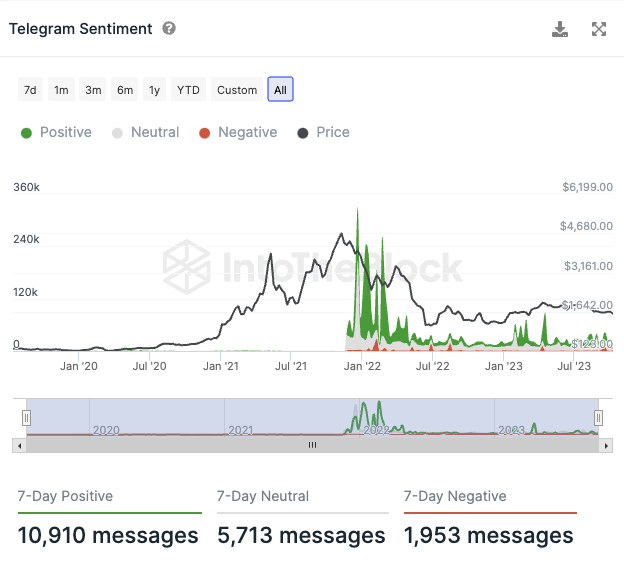 Die Stimmung auf Telegram gegenüber Ethereum bleibt überwiegend positiv. Denn in den letzten sieben Tagen wurden 10.910 positive Nachrichten gegenüber 1.953 negative Nachrichten gezählt.
