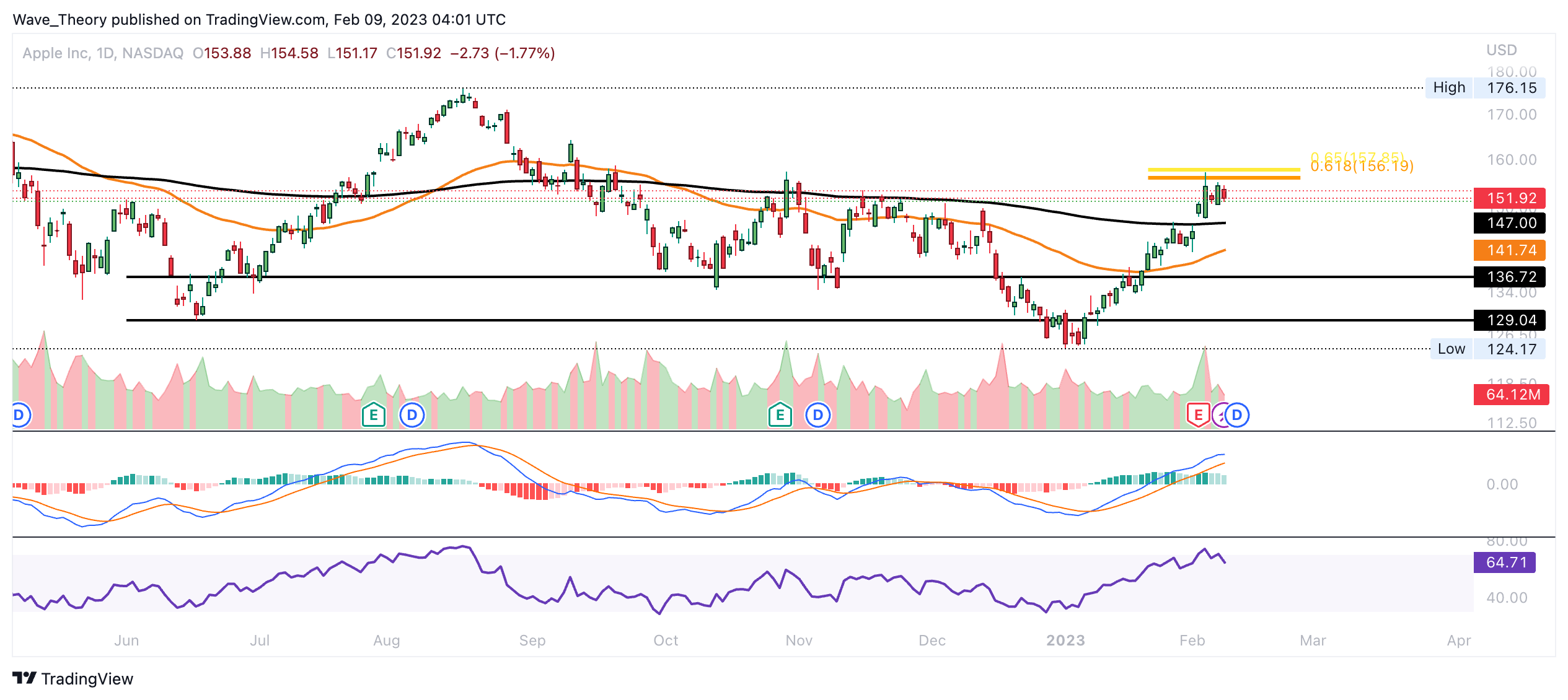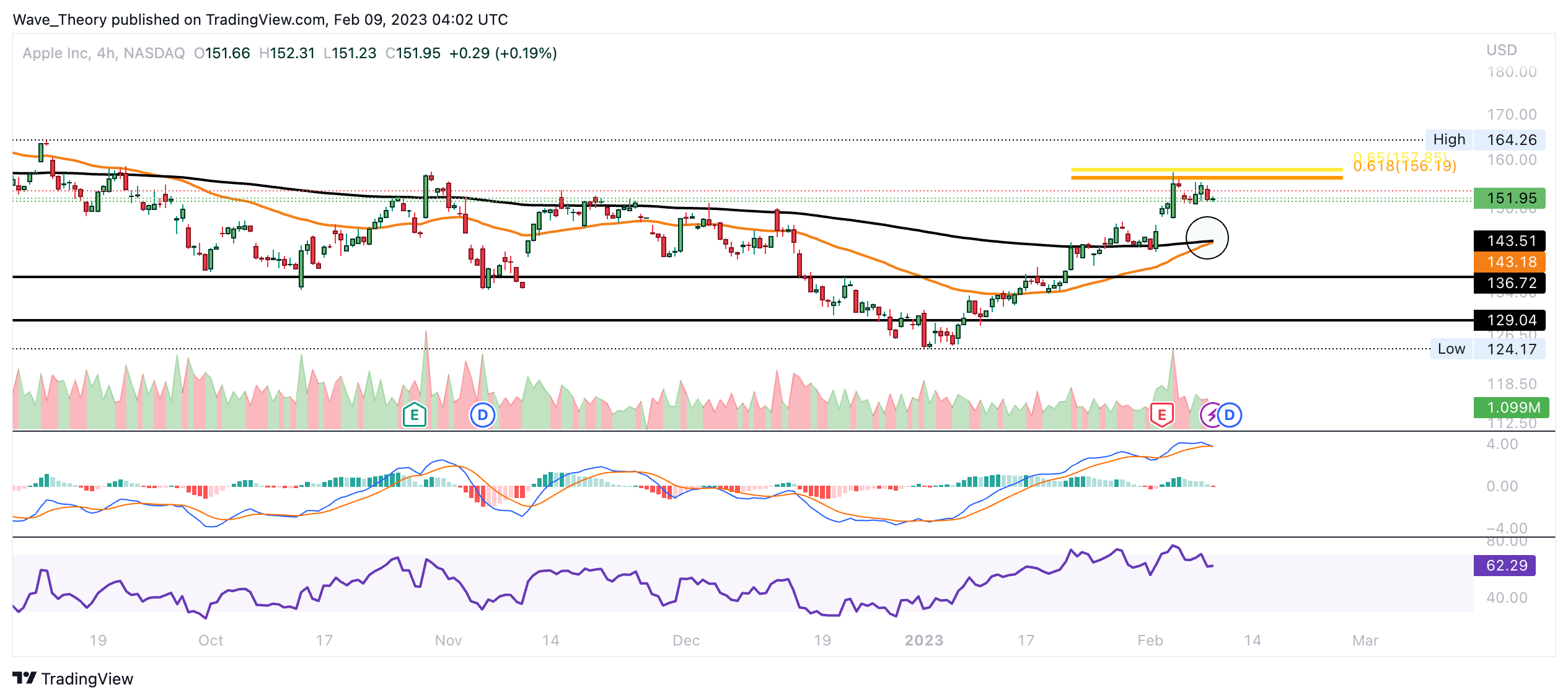 Die MACD Linien sind im Tageschart aber noch bullisch überkreuzt. Sollte APPL den Golden Ratio Widerstand bei rund 160 USD bullisch brechen, wartet bei rund 176 USD der nächste signifikante Widerstand auf die Apple Aktie.