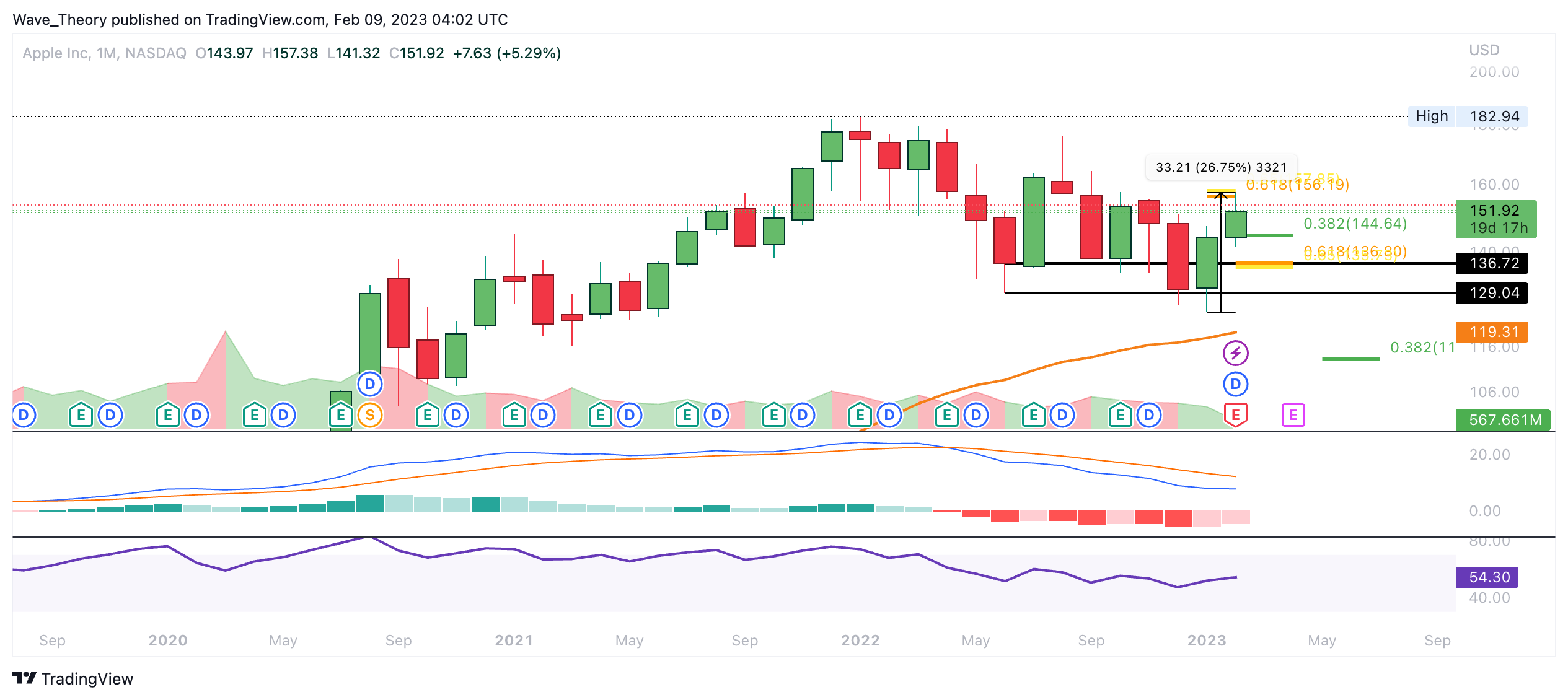 SponsoredSollte der Apple Kurs die Unterstützung zwischen 129 USD und 136 USD bärisch brechen, wartet spätestens am 50-Monate-EMA signifikante Fib Unterstützung zwischen 113 USD und 117 USD.