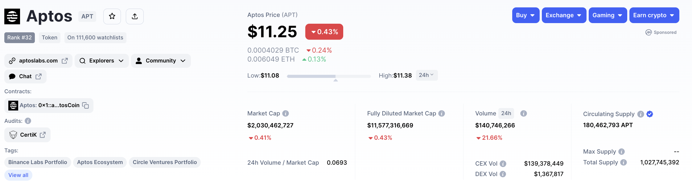 Die Marktkapitalisierung von Aptos beläuft sich auf etwa 2 Milliarden USD