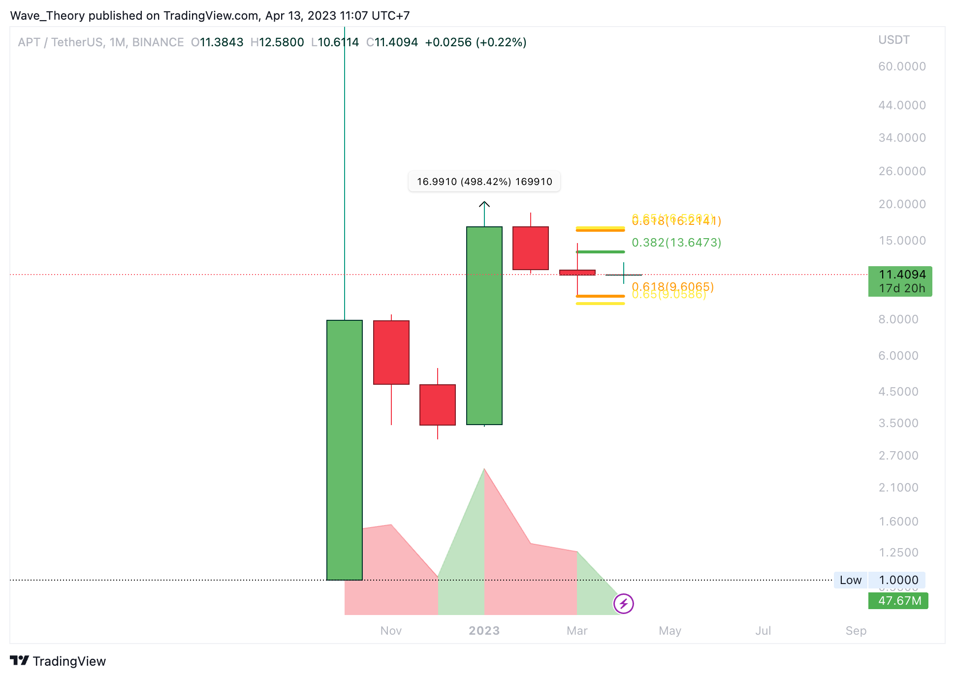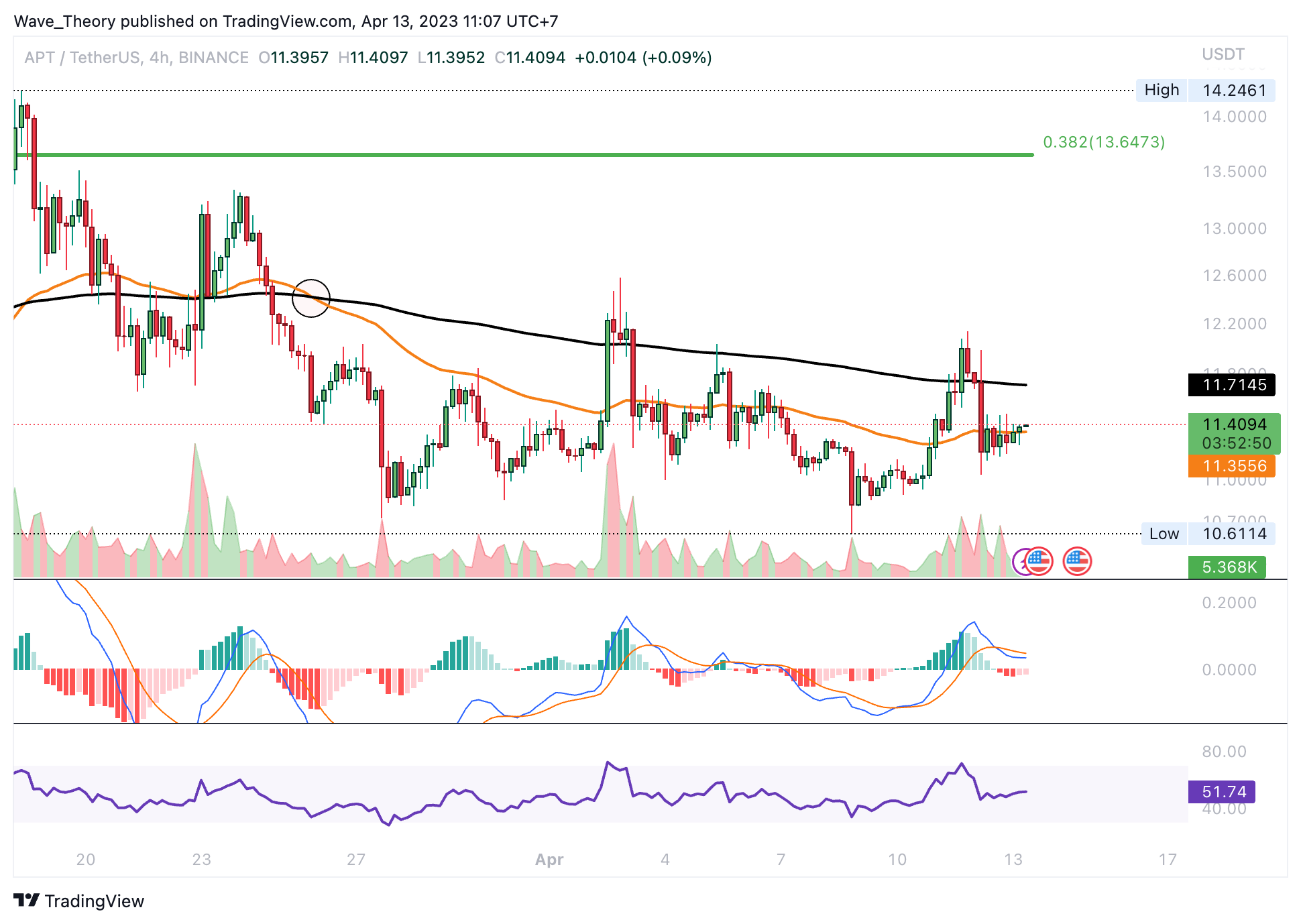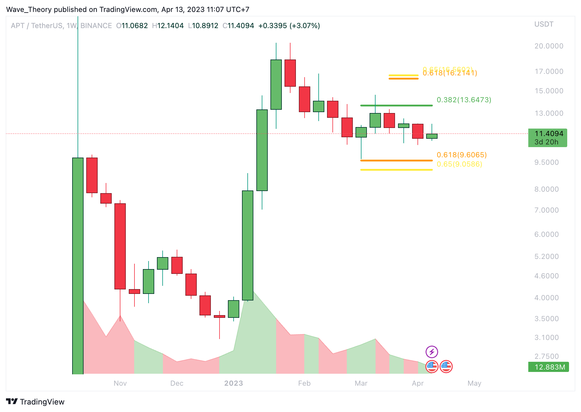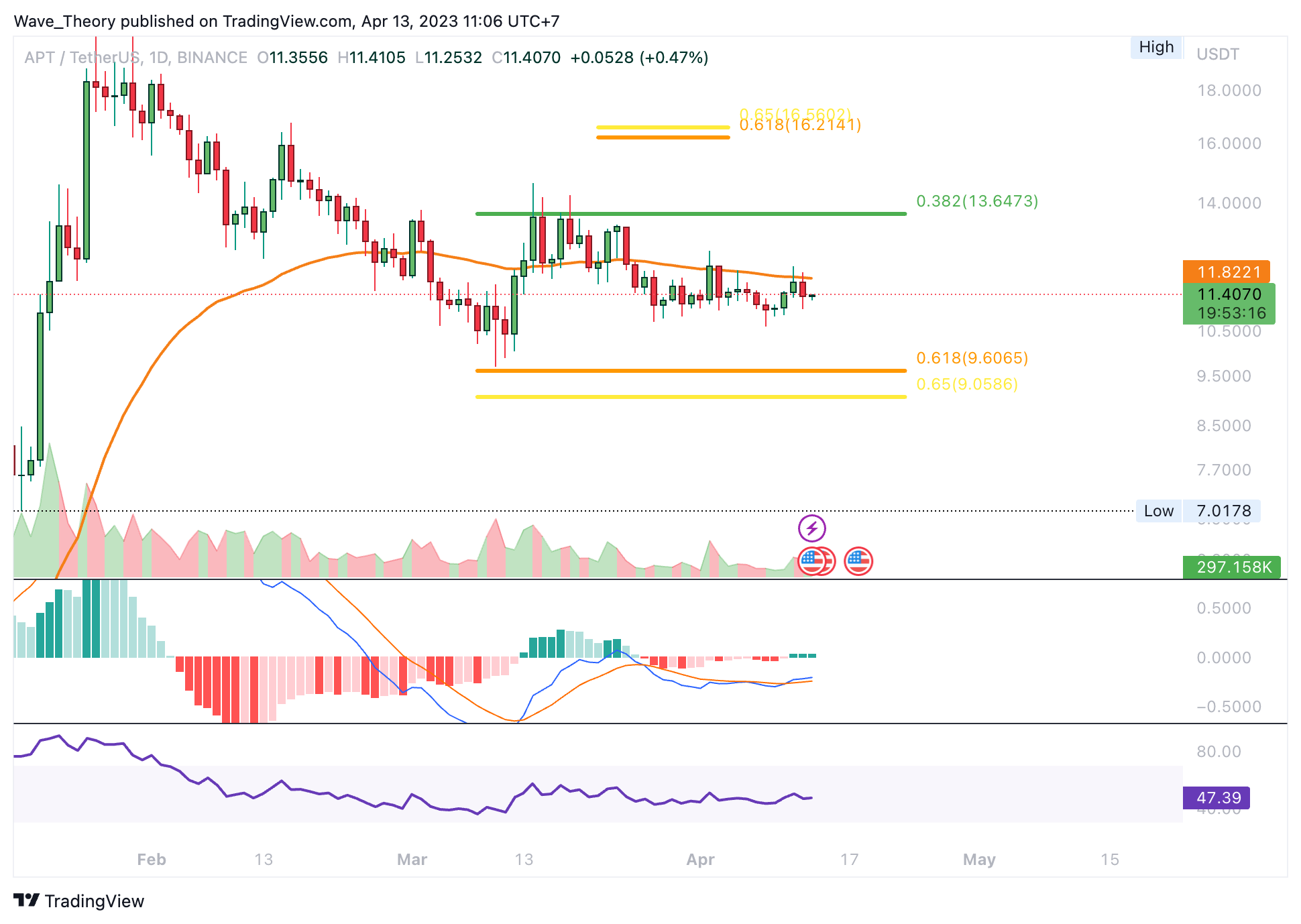 - Aptos stieg anschließend zum 0,382 Fib Widerstand bei 13,65 USD an, wurde aber bärisch abgewiesen