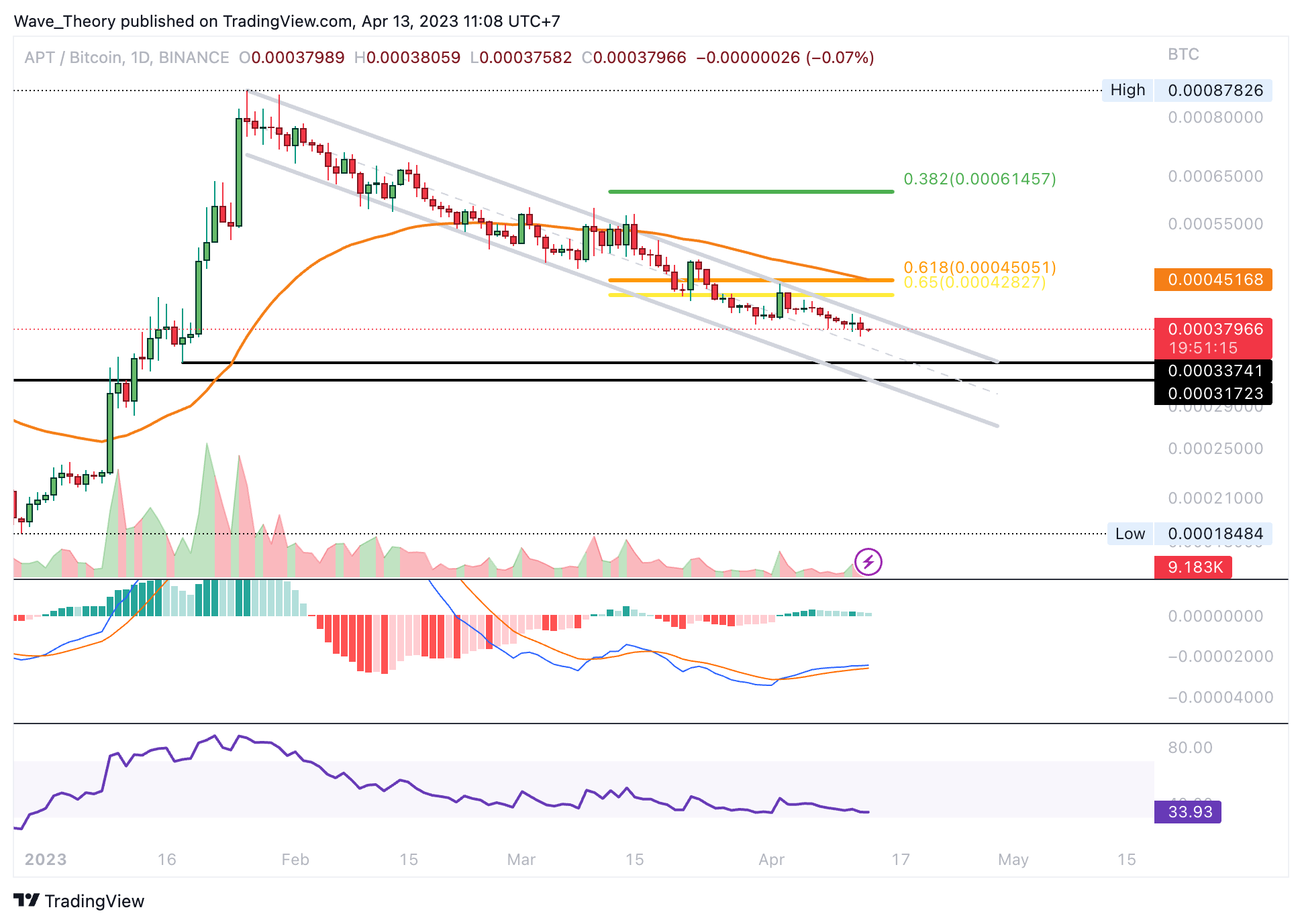 Gegen BTC befindet sich der Aptos Kurs in einem parallelen Abwärtskanal