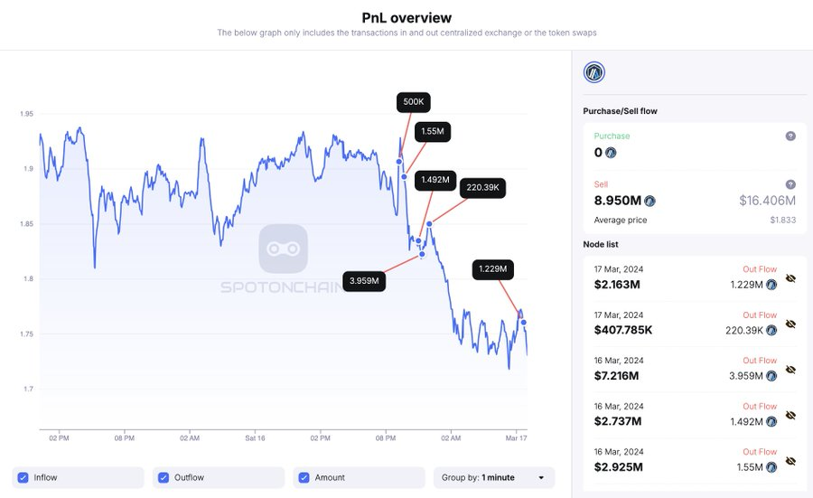 Unmittelbar nach der Freigabe der Token identifizierte das Blockchain Analyse Unternehmen SpotOnChain sechs Wallets, die Token von den Vesting Verträgen des Netzwerks erhielten und diese anschließend an Krypto Börsen transferierten. Die Daten von SpotOnChain zeigen, wie diese Adressen 8,95 Millionen ARB Token im Wert von rund 16,4 Millionen USD an Binance transferierten. Auffällig ist, dass diese Wallets immer noch 32,95 Millionen ARB Token im Wert von rund 56,7 Millionen USD halten.