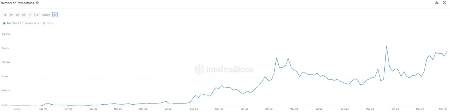Es scheint jedoch, als würde das Netzwerk wieder an Zugkraft gewinnen, denn wie die jüngsten Daten von IntoTheBlock zeigen, stiegt die Netzwerkaktivität drastisch. Die Anzahl der Transaktionen ist seit gestern wieder in Richtung zwei Millionen tägliche Transaktionen gestiegen – ein jüngst erreichter, kurzzeitiger Rekordwert.