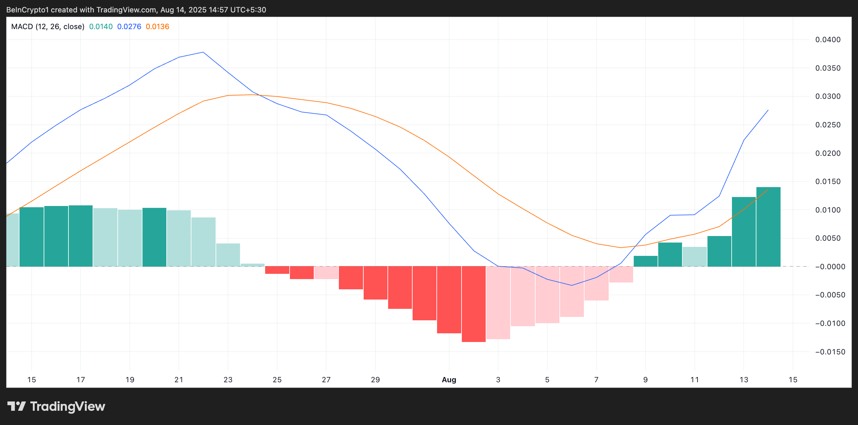 Außerdem wachsen die Histogrammbalken, die den MACD-Indikator bilden, seit dem 6. August allmählich, wobei die grünen Balken an Größe zunehmen. Wenn dies geschieht, deutet es darauf hin, dass der Aufwärtstrend an Stärke gewinnt.