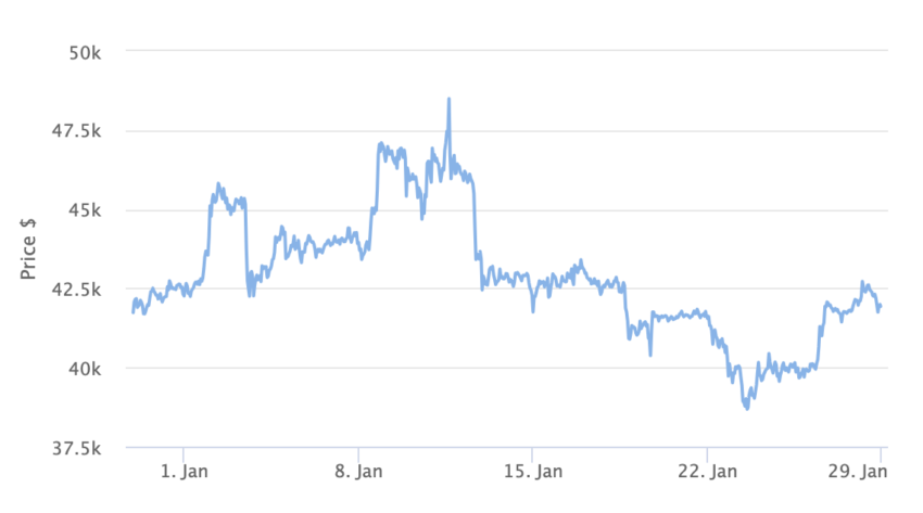 “Dieses Argument [Grayscale sei am Fall des BTC Kurses schuld] ist falsch, denn wenn man die Abflüsse aus dem GBTC mit den Zuflüssen in die neu gelisteten Bitcoin Spot ETFs verrechnet, ergibt sich zum 22. Januar ein Nettozufluss von 820 Millionen US-Dollar.”