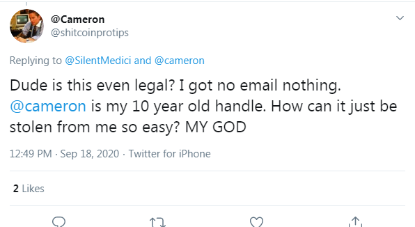 BeinCrypto bat Winklevoss um einen Kommentar, aber wir erhielten bis zum Zeitpunkt der Veröffentlichung des Artikels keine Rückmeldung. In der Zwischenzeit bestätigt ein Blick auf die Twitter-Seite von Winklevoss, dass er tatsächlich der aktuelle Eigentümer des @Cameron-Handles ist.
