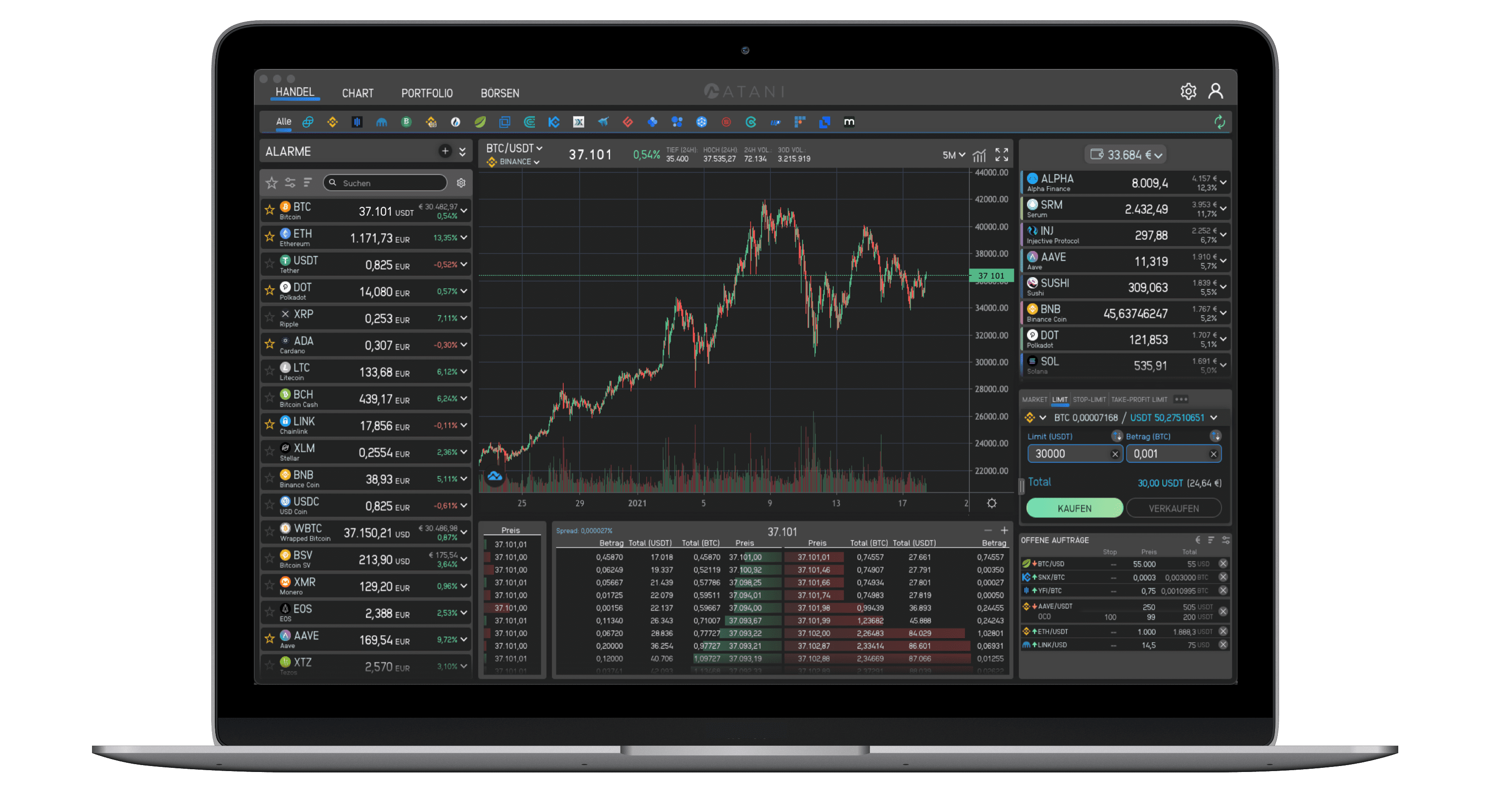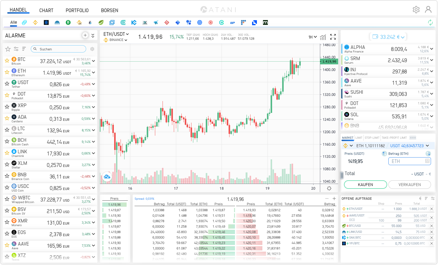 Wenn du derzeit eine Kombination dieser Börsen verwendest, kannst du über die einheitliche Benutzeroberfläche von Atani mit allen Börsen handeln. Alle Standard-Handelsfunktionen wie Market Orders, Limit Orders, Stop Loss oder Take Profit Orders und One-Cancels-the-Other (OCO) Orders sind enthalten.
