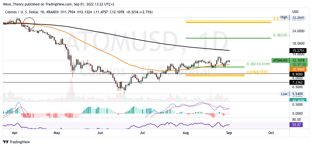 Seit der ATOM Kurs die Unterstützungszone zwischen 7,23 und 8,9 USD im Juni erreicht hat, stieg der Cosmos Kurs sehr stark. Sollte Cosmos die Aufwärtsbewegung fortsetzen, warten bei rund 20,4 USD und 30 USD die entscheidenden Fibonacci Widerstände.