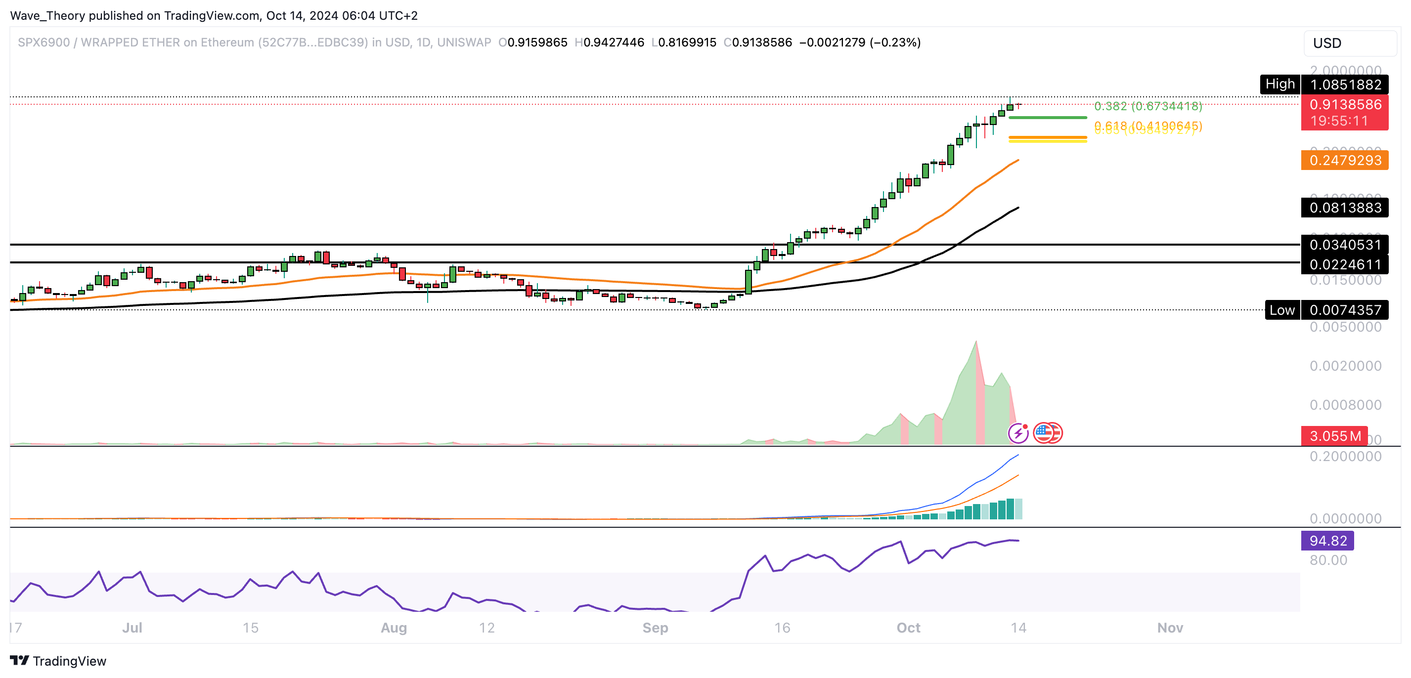 In den letzten sechs Wochen ist der Kurs um rund 15.000 % gestiegen. Damit weist SPX einen massiven Aufwärtstrend auf. So zeigt sich der MACD auch eindeutig bullisch und der RSI erreicht astronomische Höhen.