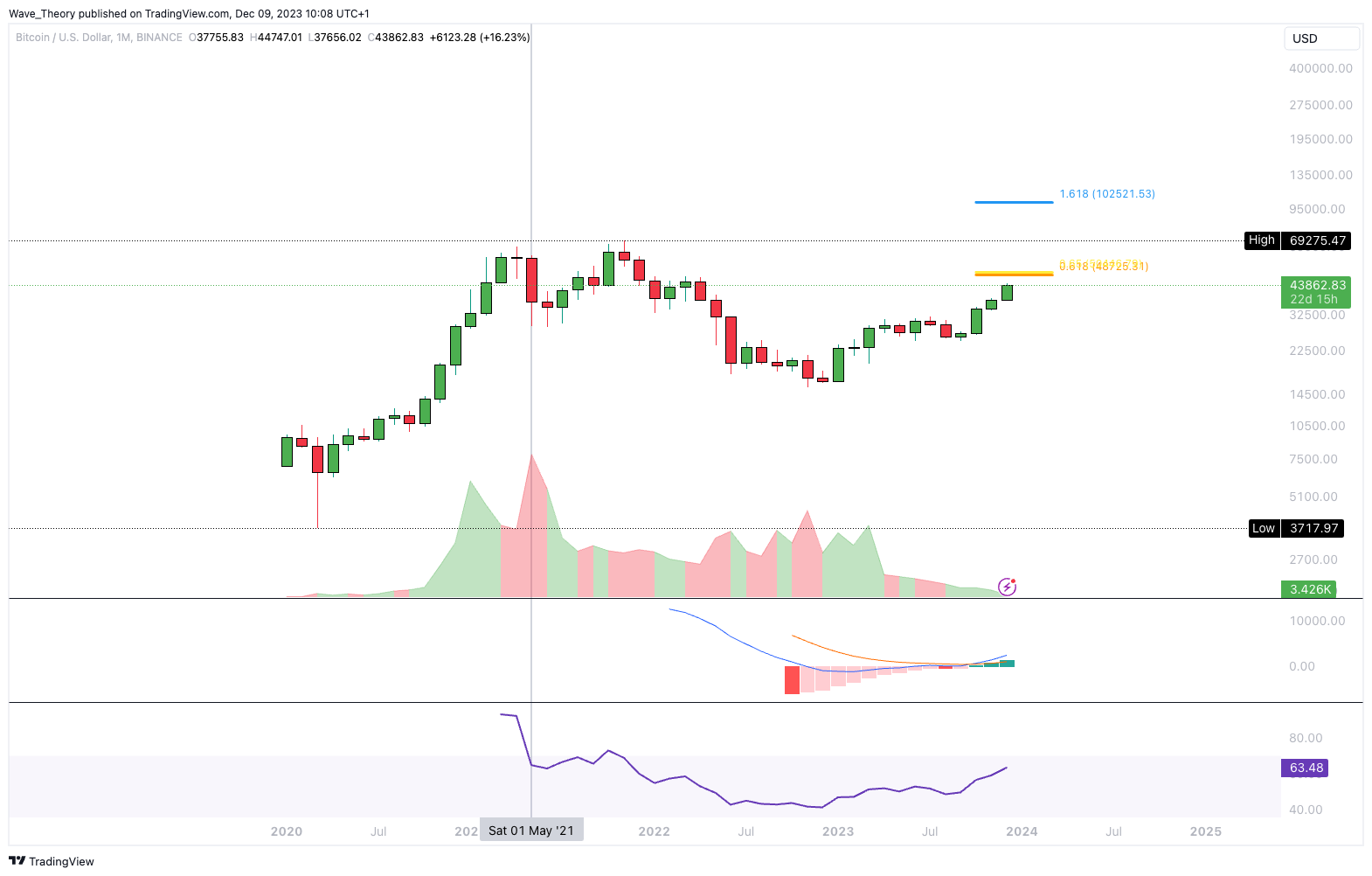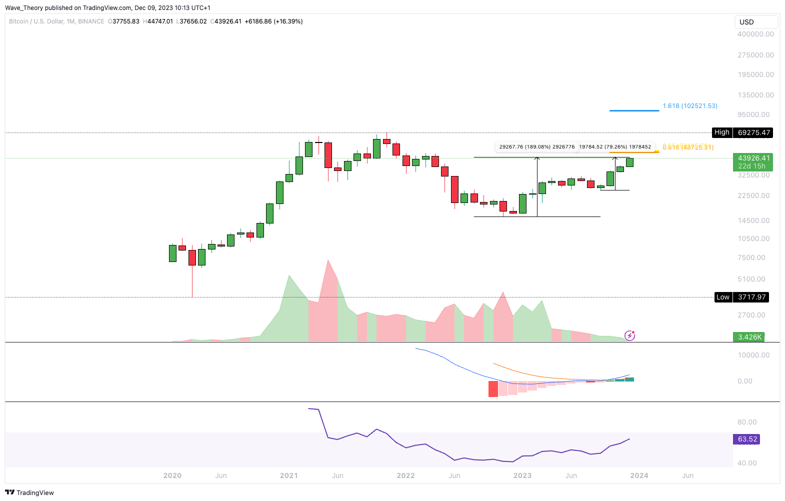 Denn an der 100.000 USD Marke liegt eine wichtige Fibonacci Projektion. Auch hinsichtlich der Marktkapitalisierung von Bitcoin, insbesondere mit einem möglichen ETF in Aussicht, ist ein Preis von 100.000 USD alles andere als unrealistisch.