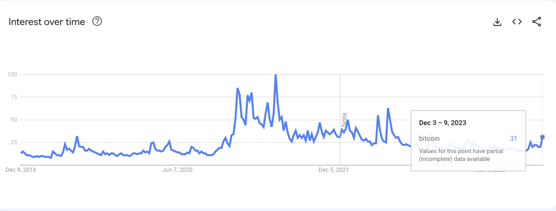 Zu diesem Zeitpunkt war das öffentliche Interesse von Bitcoin sogar nur halb so groß wie jetzt