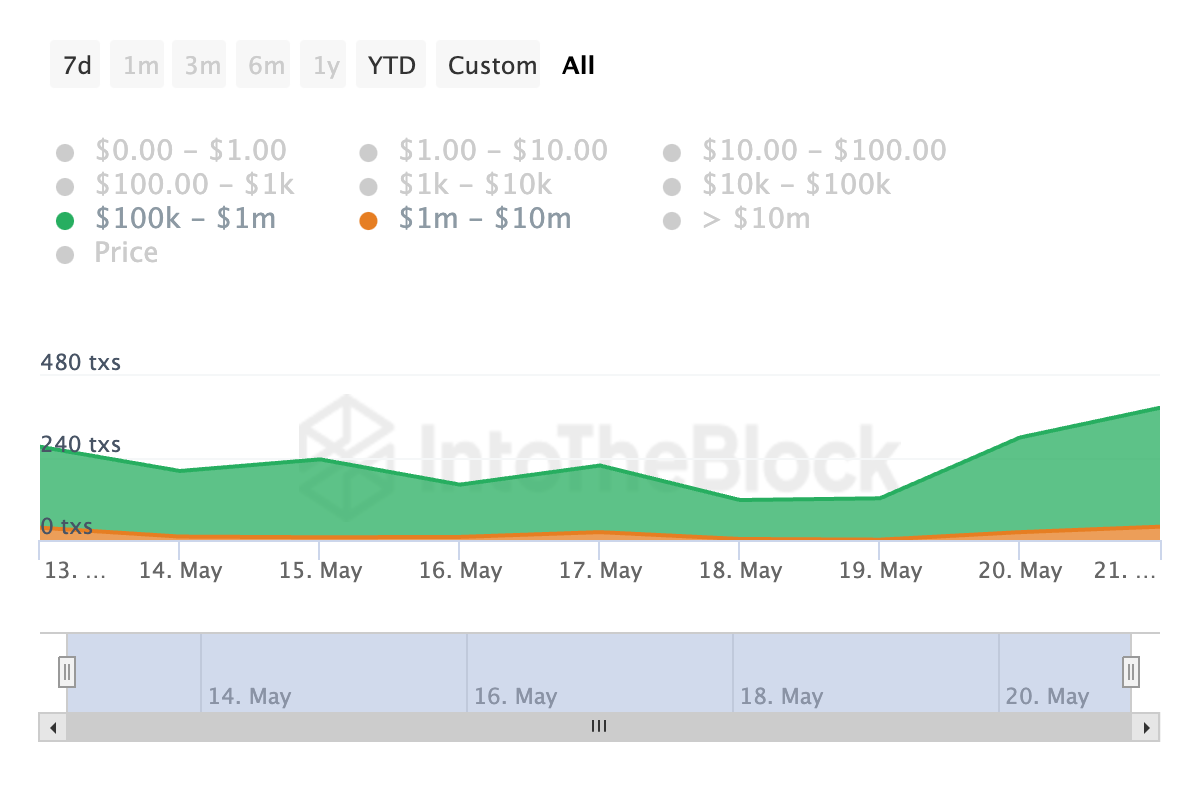 AVAX hat auch einen Anstieg des Volumens großer Transaktionen verzeichnet. Dies signalisiert einen Anstieg der Wal-Aktivität im betrachteten Zeitraum.