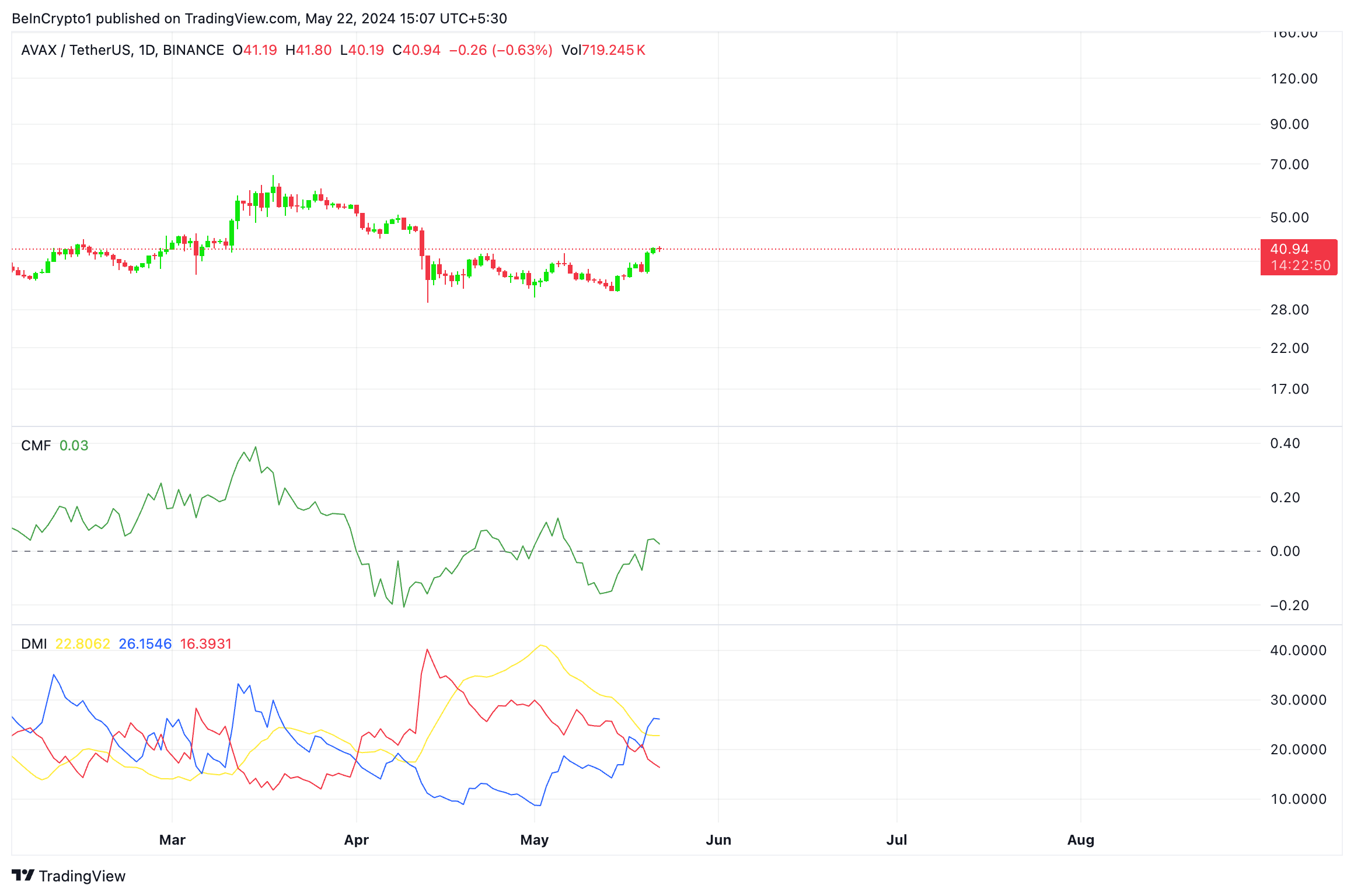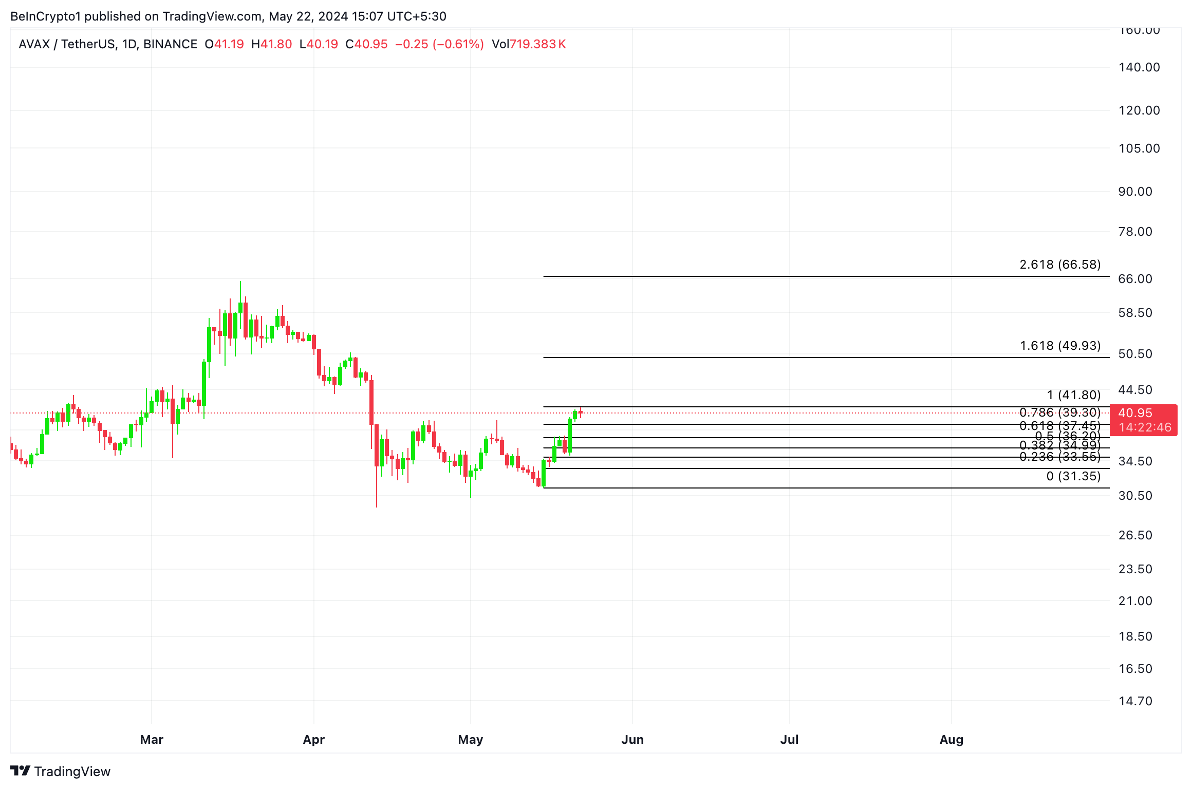 Zum aktuellen Zeitpunkt handelt AVAX bei 41,24 USD. Die 7-prozentige Rallye des Altcoin Kurses im letzten Monat spiegelt das Wachstum des gesmaten Marktes in diesem Zeitraum wider.