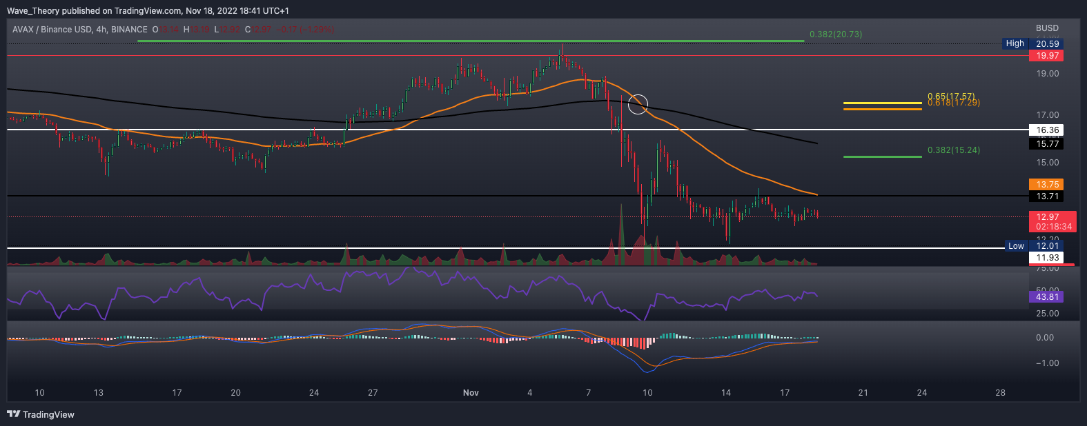 Der AVAX Kurs wurde am Fib Widerstand bei rund 20,7 USD bärisch abgewiesen und kehrte anschließend zur Unterstützung zwischen 9,3 USD und 12 USD zurück.