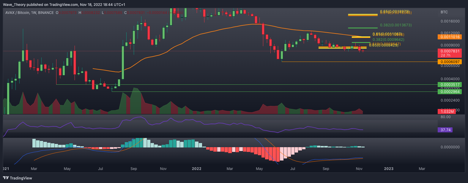 Gegen BTC hat der AVAX Kurs die Golden Ratio Unterstützung bärisch gebrochen