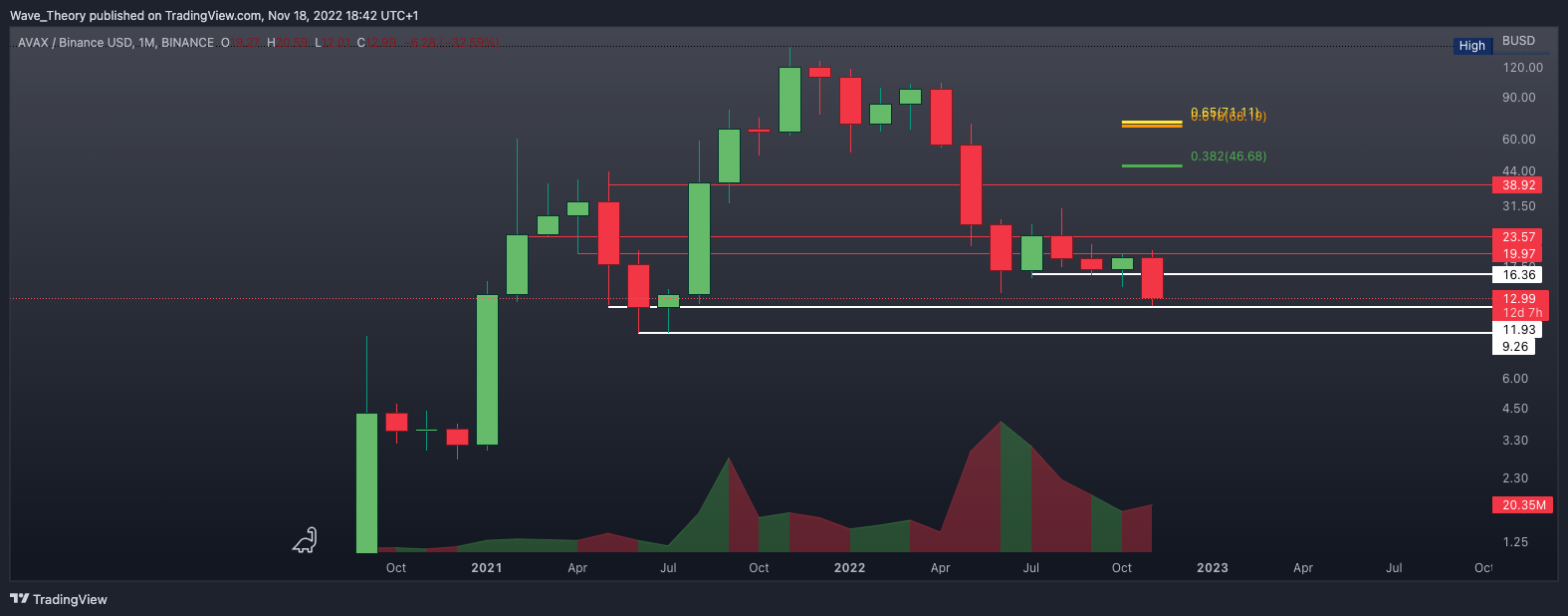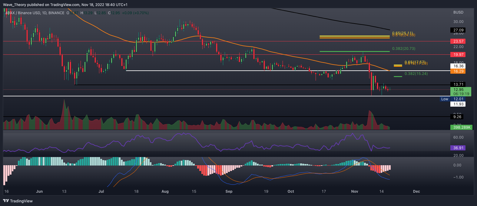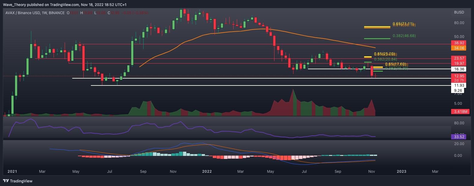 Der AVAX Kurs stieg exakt zum 0,382 Fib Widerstand bei rund 20,7 USD, woran Avalanche stark abgewiesen wurde. Daraufhin fiel der AVAX Kurs zur Unterstützungslinie bei rund 12 USD zurück, womit AVAX ein neues Jahrestief erreicht hat. Dort angekommen, konnte AVAX bisher zweimal abprallen.
