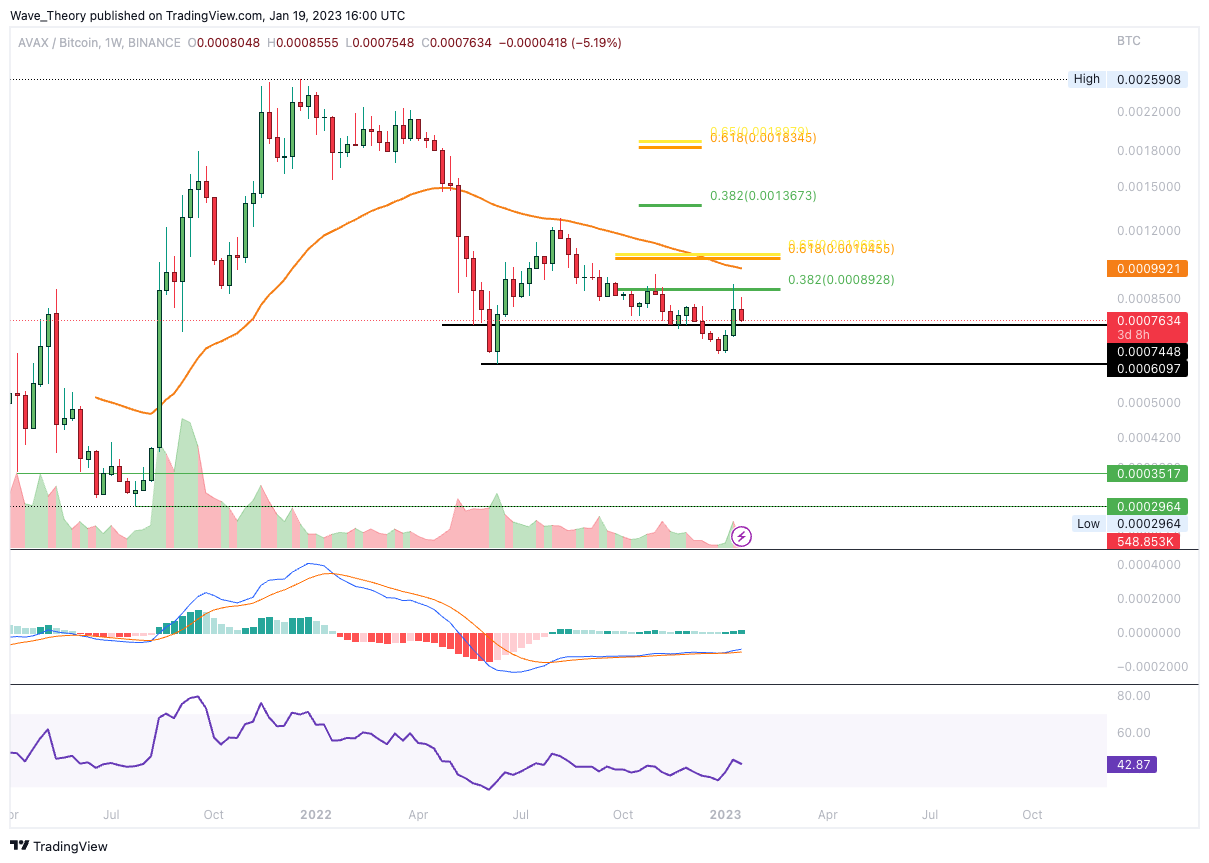 Damit befindet sich der Avalanche Kurs jetzt wieder an der Unterstützungszone. Ansonsten tickt das Histogramm des MACDs die dritte Woche in Folge bullisch höher und auch die MACD Linien sind im Wochenchart bullisch überkreuzt. Sollte AVAX den 0,382 Fib Widerstand bei rund 0,00089 BTC bullisch brechen, wartet am 50-Wochen-EMA bei rund 0,001 BTC der nächste signifikante Fib Widerstand.