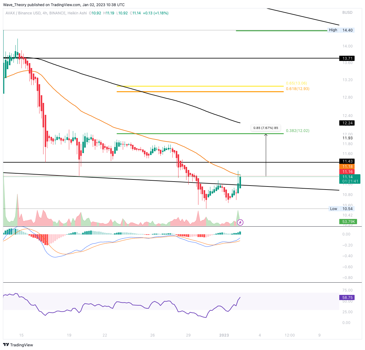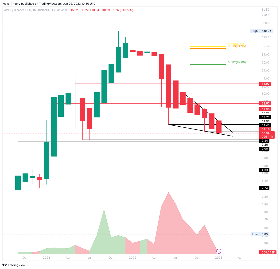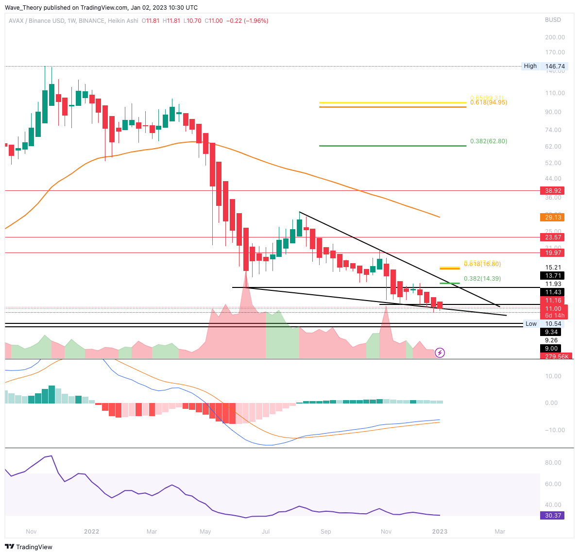 Im Wochenchart befindet sich der AVAX Kurs in einem bullischen Falling Wedge Kursmuster, aus welchem der Avalanche Kurs bullisch ausbrechen könnte, sofern AVAX den 0,382 Fib Widerstand bei rund 14,4 USD bricht. Zudem warten dann bei rund 17 USD der nächste signifikante Fib Widerstand.