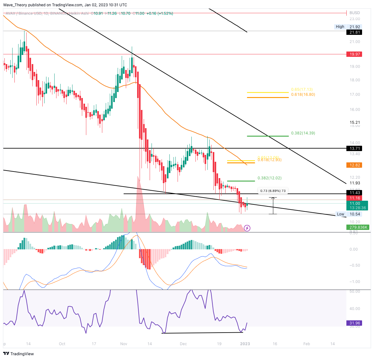 Der AVAX Kurs erreichte letztes Jahr ein neues Jahrestief bei rund 10,54 USD, womit der RSI jetzt eine bullische Divergenz aufbaut. Damit könnte AVAX zum nächsten Fib Widerstand bei rund 12 USD steigen. Tatsächlich stieg der AVAX Preis schon rund 6,9 % seit Avalanche auf den tiefsten Punkt des Jahres 2022 gefallen ist.