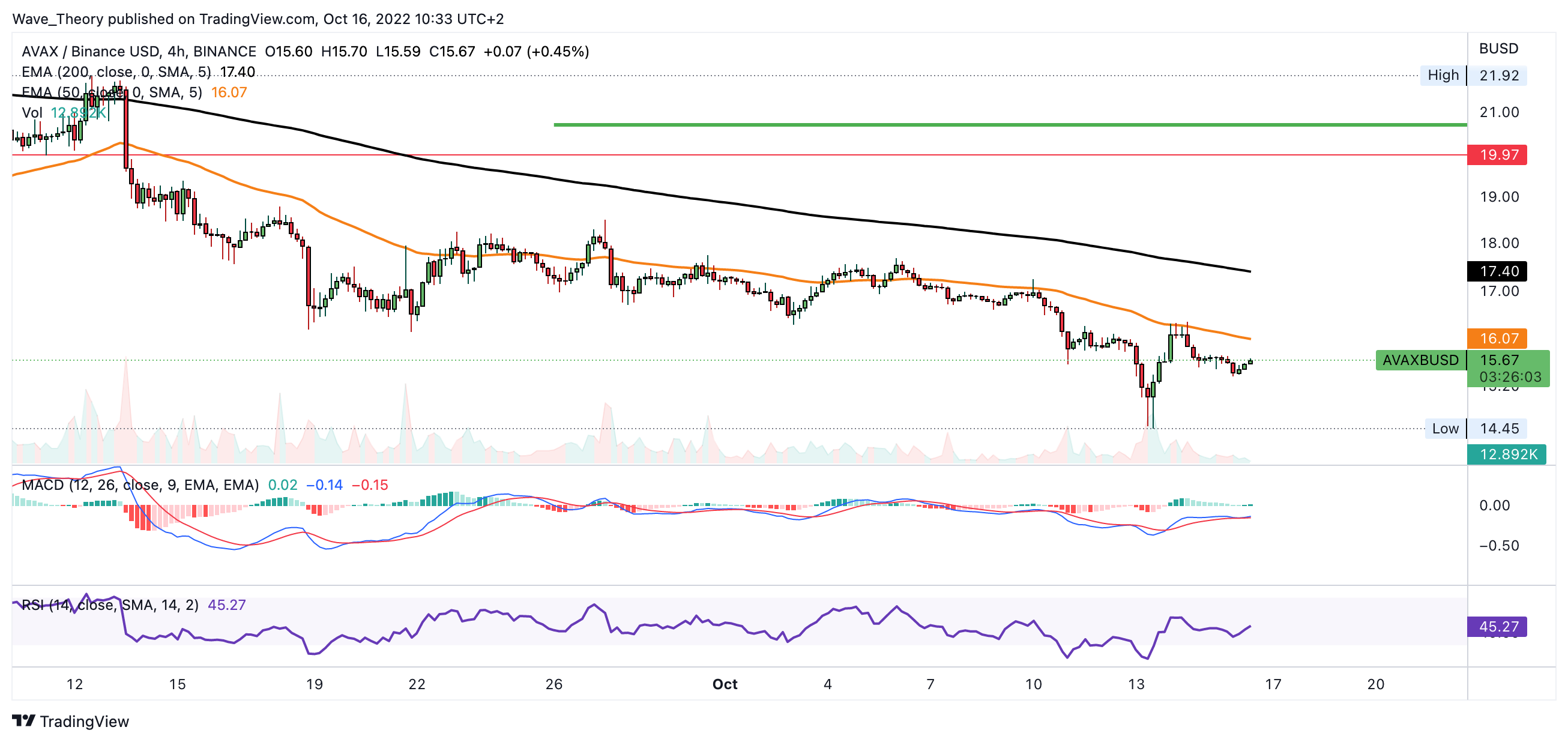 Im 4H-Chart bleibt das Death Cross intakt, womit der Trend kurzfristig bärisch bestätigt bleibt. Zudem fungiert der 50-4H-EMA bereits bei rund 16 USD als signifikanter Widerstand, welchen der AVAX Kurs seit Beginn des Monats nicht mehr überwinden konnte.