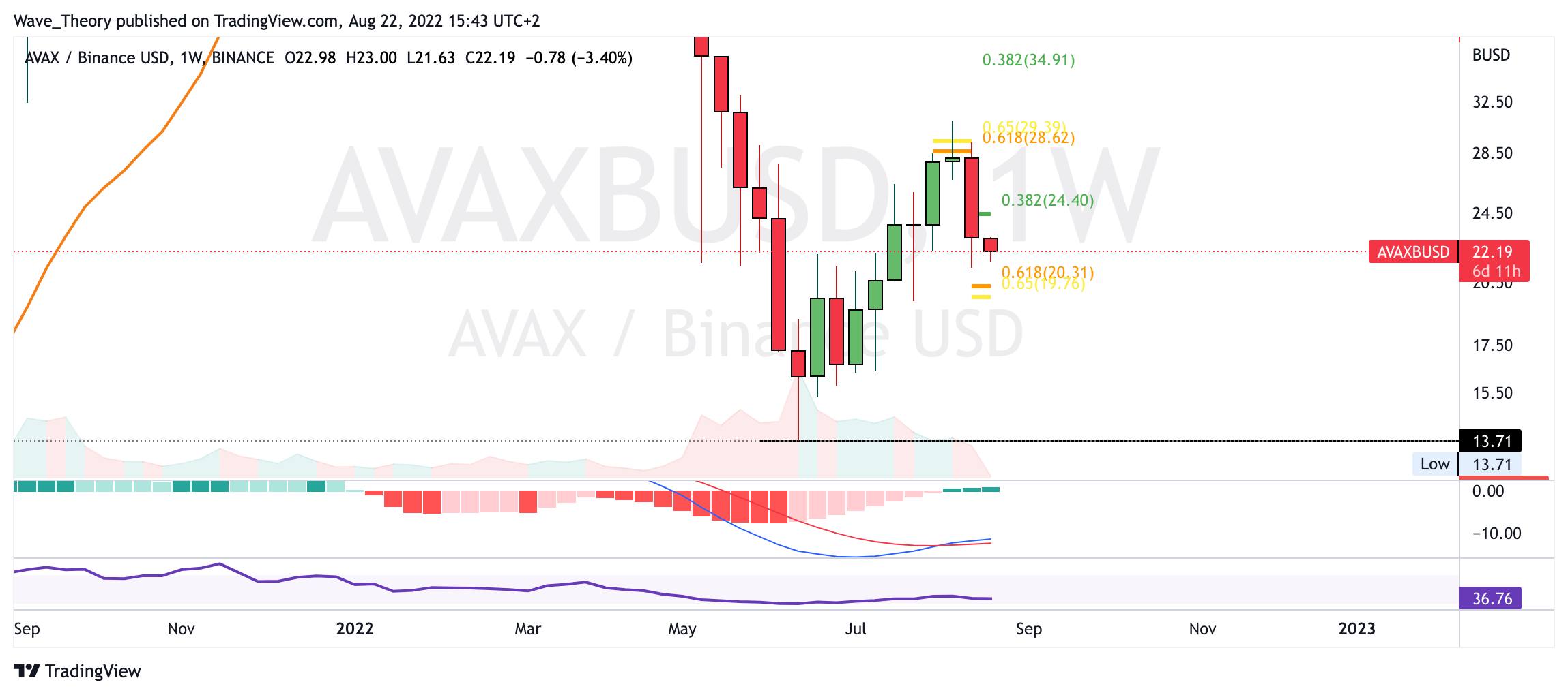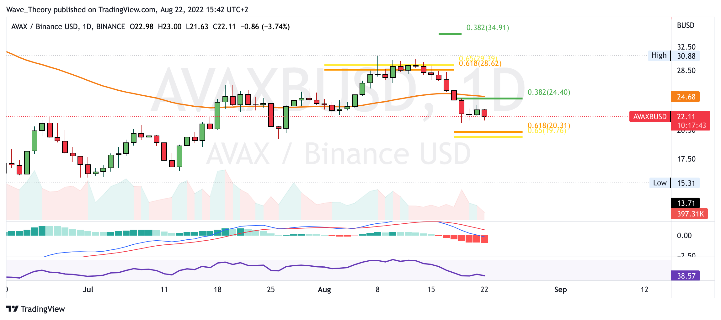 Der AVAX Kurs wurde am Golden Ratio Widerstand bärisch abgewiesen. Kehrt der AVAX Kurs jetzt auf das Jahrestief bei rund 14 USD zurück?