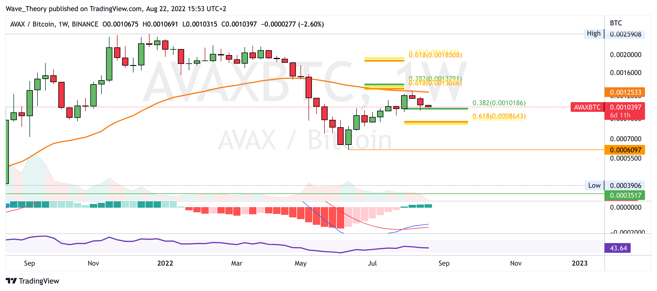Aber auch hier wurde der AVAX Kurs am Golden Ratio Widerstand bärisch abgewiesen, welcher den 50-Wochen-EMA bei rund 0,00125 BTC schneidet.