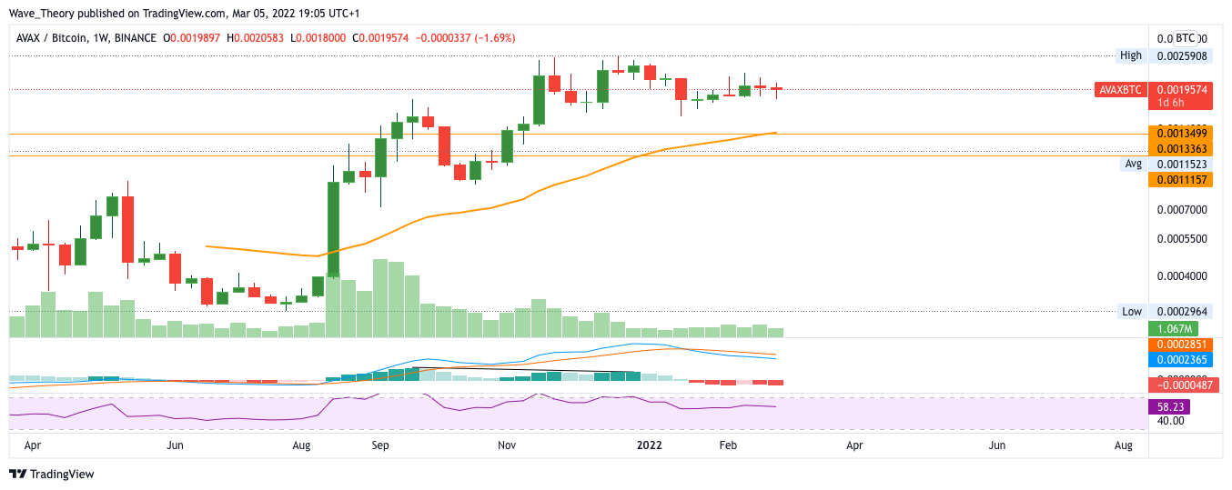 Gegen BTC zeigt sich der MACD eindeutig bärisch: Die MACD Linien sind bärisch überkreuzt und das Histogramm tickt bärisch tiefer. Sollte AVAX seine Korrektur fortsetzen, findet er zwischen 0,0011 – 0,00135 BTC massive Unterstützung. Bei 0,00135 BTC liegt außerdem der 50-Wochen-EMA, welcher als zusätzliche Unterstützung dient. Nach oben hin wartet am ATH bei rund 0,0026 BTC signifikanter Widerstand auf den AVAX Kurs.