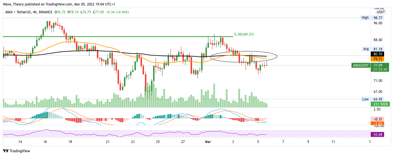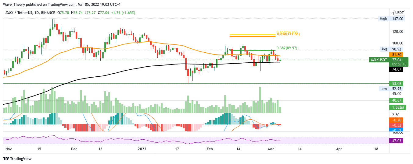 Zwar zeigte der AVAX Kurs ebenfalls sehr heftige Volatilität auf, nachdem er vom Höhepunkt bei rund 150 USD auf rund 50 USD korrigiert hatte, jedoch kämpfte sich AVAX sehr schnell wieder über die 100 USD Marke. Aktuell befindet sich der AVAX Kurs mit 77 USD genau im Mittelfeld. Am 200-Tage-EMA bei rund 74 USD stößt AVAX aktuell auf starke Unterstützung. Bei rund 90 USD wartet signifikanter Fibonacci Widerstand auf den AVAX Kurs, woran AVAX zuvor einige Male gescheitert ist. Auch der MACD zeigt sich im Tageschart bärisch, denn die MACD Linien sind bärisch überkreuzt während das Histogramm bärisch tiefer tickt.