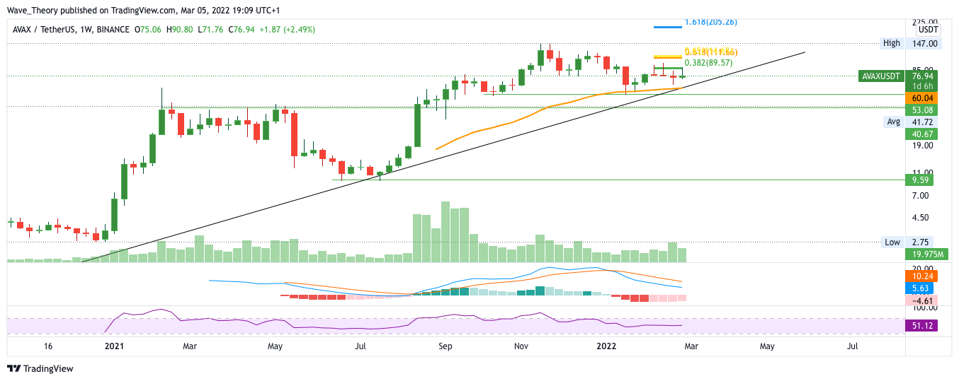 Im Wochenchart zeigt sich der MACD tendenziell bullisch, denn das Histogramm tickt seit einigen Wochen bullisch höher. Sollte es AVAX gelingen, das 0,382 Fib Niveau bei rund 90 USD bullisch zu durchbrechen, so wartet bei rund 115 USD der entscheidende Schlüsselwiderstand auf den AVAX Kurs. Bricht AVAX die Golden Ratio bei rund 115 USD, so ist die Korrektur beendet und AVAX kann sich zu seinem ATH bei rund 150 USD aufmachen. Durchbricht AVAX auch dieses Preisniveau, wartet erst wieder bei rund 200 USD der nächste Fibonacci Widerstand auf den AVAX Kurs. Nach unten hin findet AVAX schon sehr bald massive Unterstützung, denn bei rund 60 USD liegt der 50-Wochen-EMA.