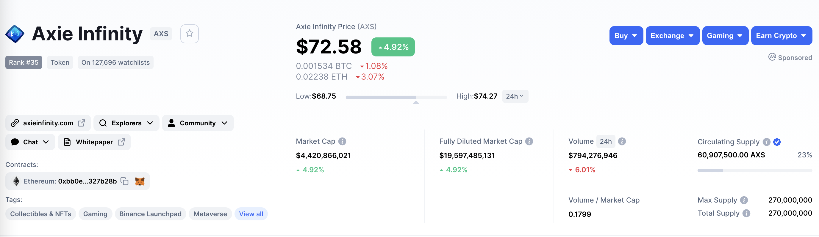 In knapp drei Monaten kletterte der Preis von Axie Infinity von 1,8 USD auf 82 USD. Damit steht AXS aktuell auf Rang 35 im Marktkapitalisierungranking.