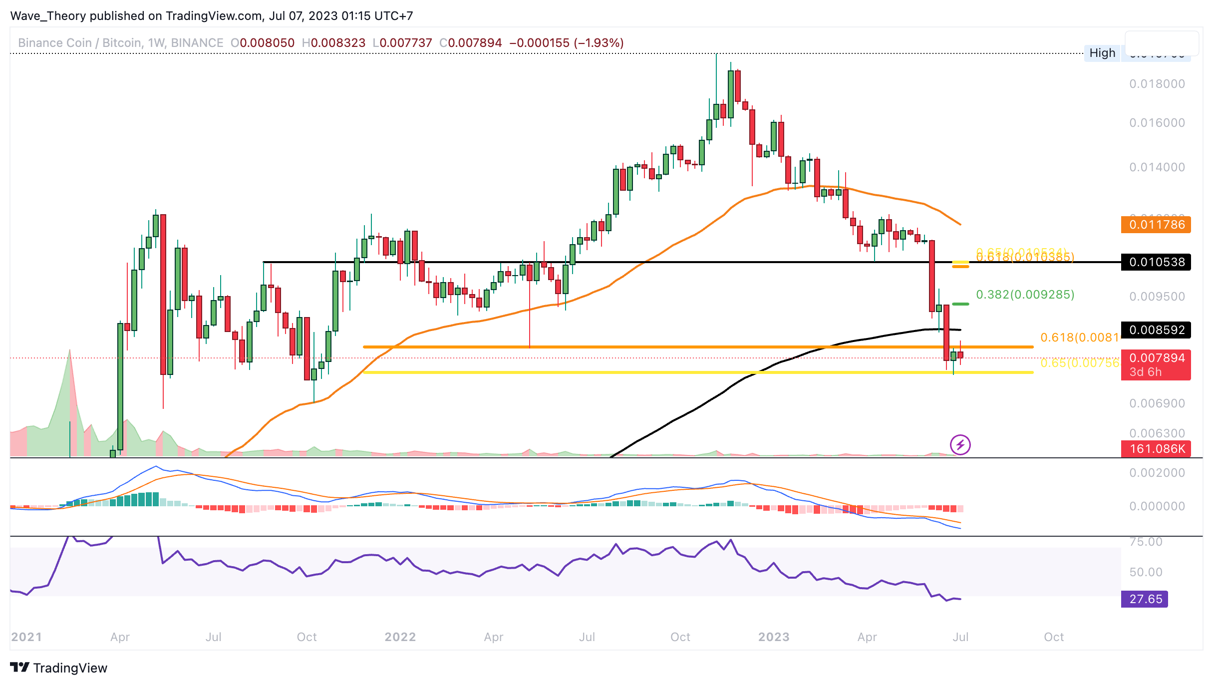 Gegen BTC stürzte der BNB Kurs ebenfalls ab. Dabei erreichte Binance Coin die Golden Ratio Unterstützung bei rund 0,008 BTC, woran der Kurs letzte Woche abprallen konnte. In dieser Woche droht BNB die Unterstützung jedoch bärisch zu durchbrechen.