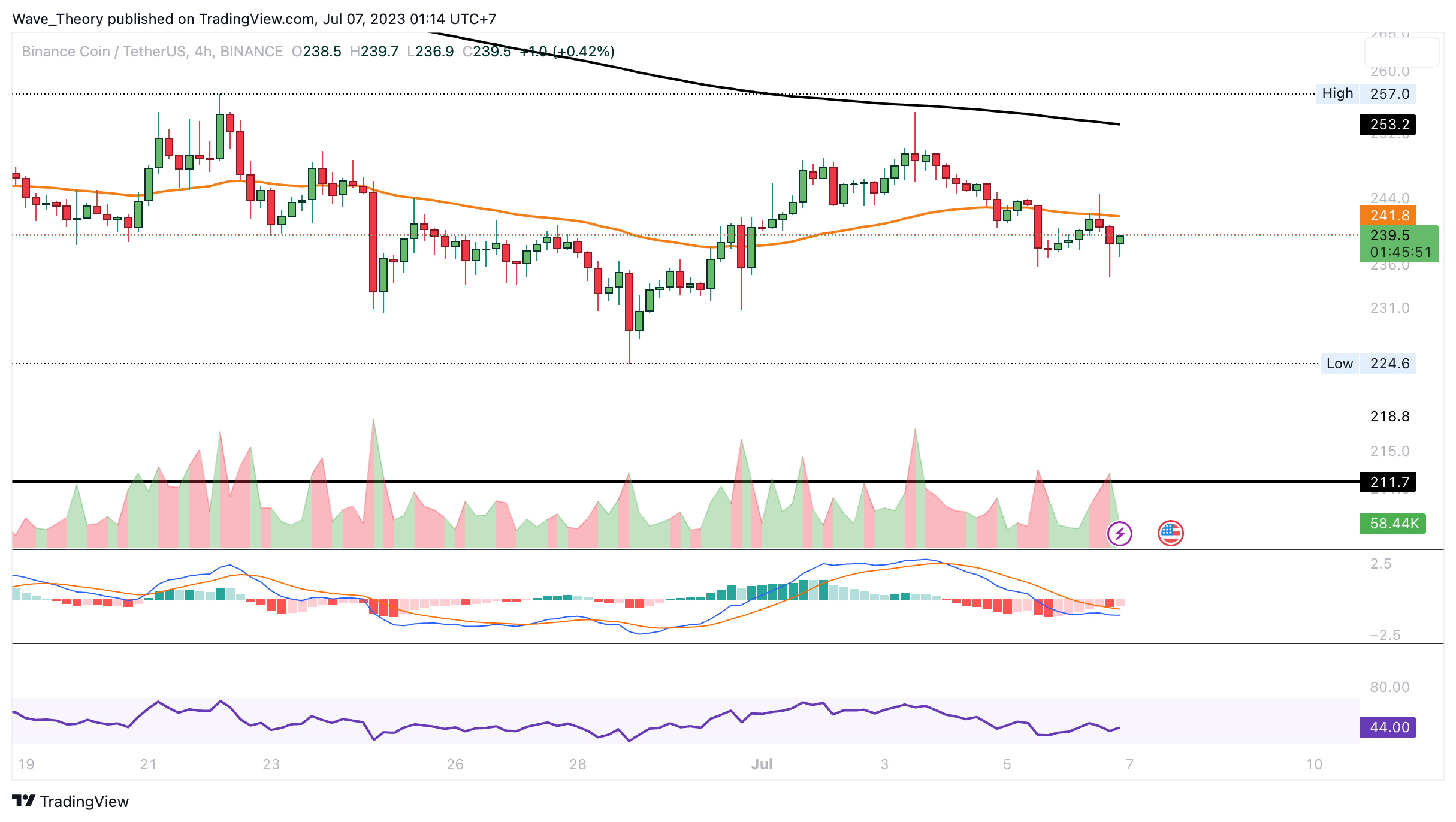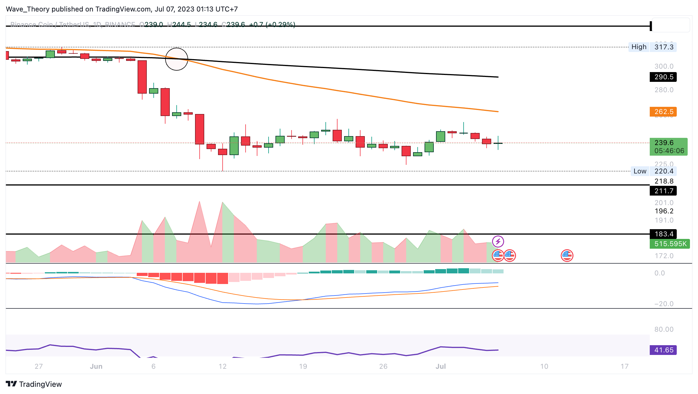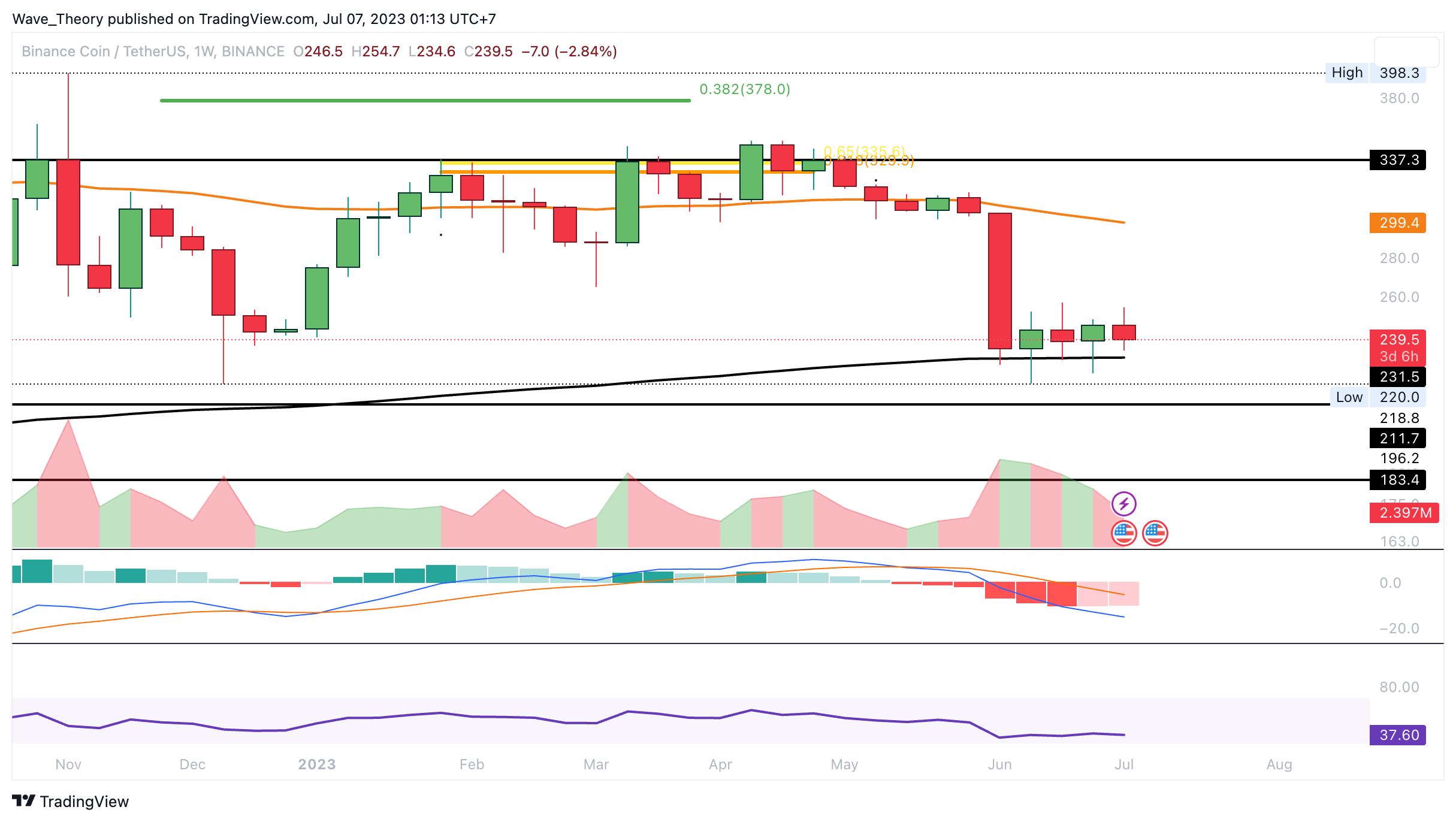 Tatsächlich hat der Binance Coin Kurs die Golden Ratio Unterstützung bei rund 265 USD bärisch gebrochen, woraufhin der Kurs kurzzeitig auf rund 220 USD gefallen war. Damit tickt nun auch das Histogramm des MACDs seit letztem Monat wieder bärisch tiefer. Die MACD Linien sind ohnehin bärisch überkreuzt, wohingegen sich der RSI neutral zeigt.