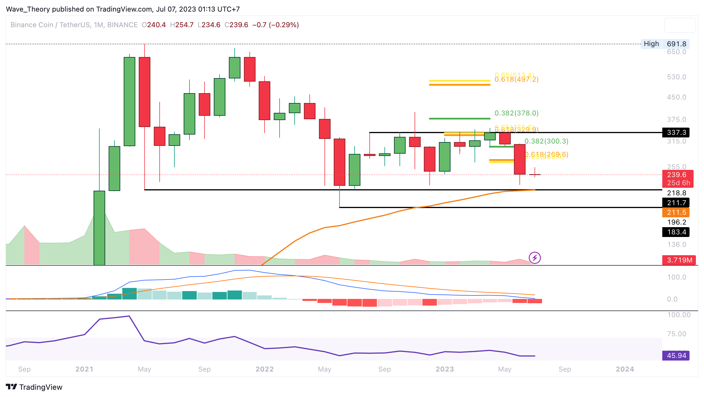 “Letzten Monat erfuhr der BNB Kurs eine heftige Korrektur, nachdem der Kurs die Golden Ratio bei rund 330 USD nicht überwinden konnte. Damit kehrte der BNB Kurs zum 0,382 Fib Niveau bei rund 300 USD zurück. Dort könnte der BNB Kurs jetzt abprallen. Falls nicht, wartet erst wieder an der Golden Ratio bei rund 265 USD signifikante Fib Unterstützung auf den BNB Kurs. Bricht Binance Coin beide Fib Niveaus, ist die Aufwärtsbewegung nicht mehr länger intakt. Dann könnte BNB den überliegenden Abwärtstrend fortsetzen, um zum 50-Monate-EMA bei rund 213 USD zu korrigieren.”
