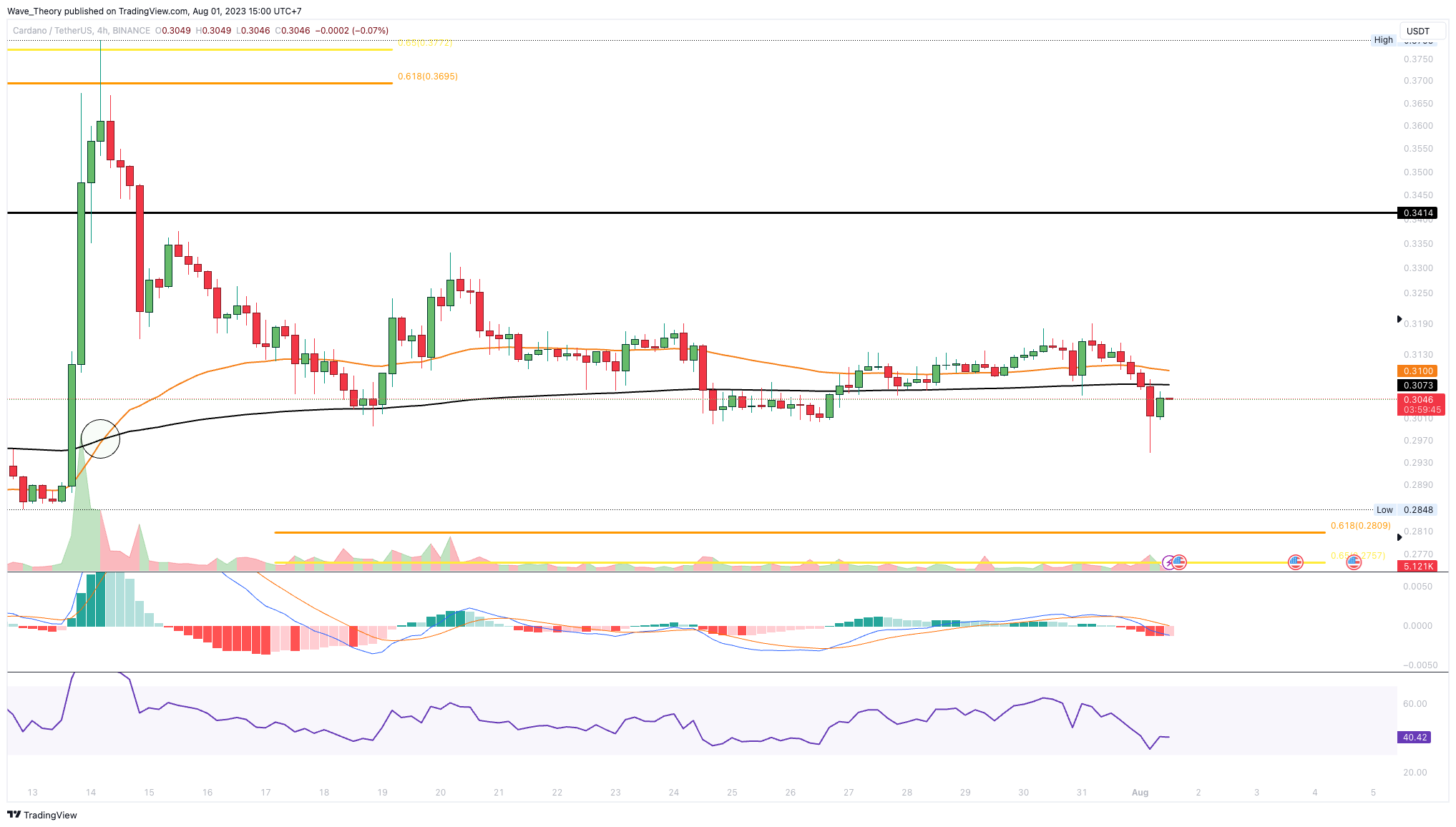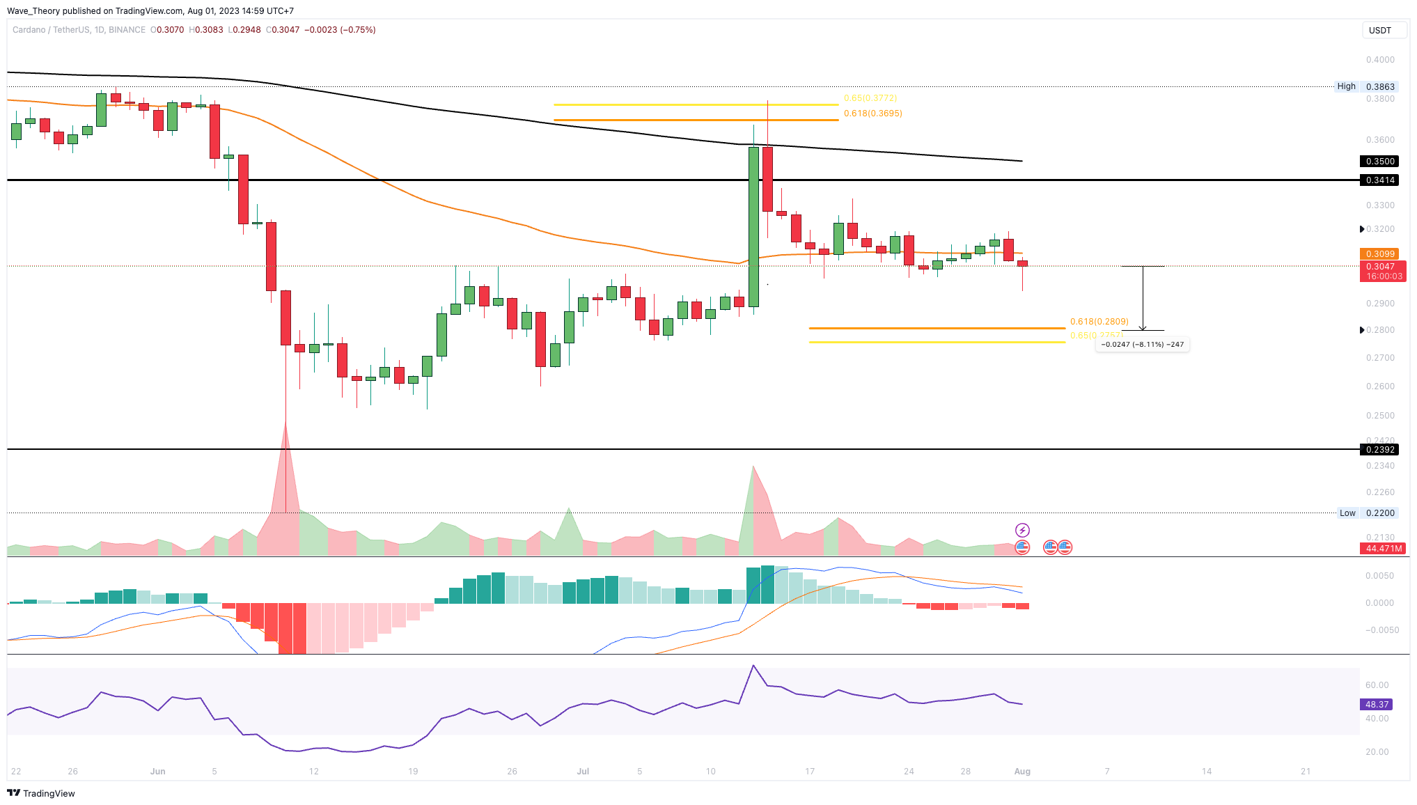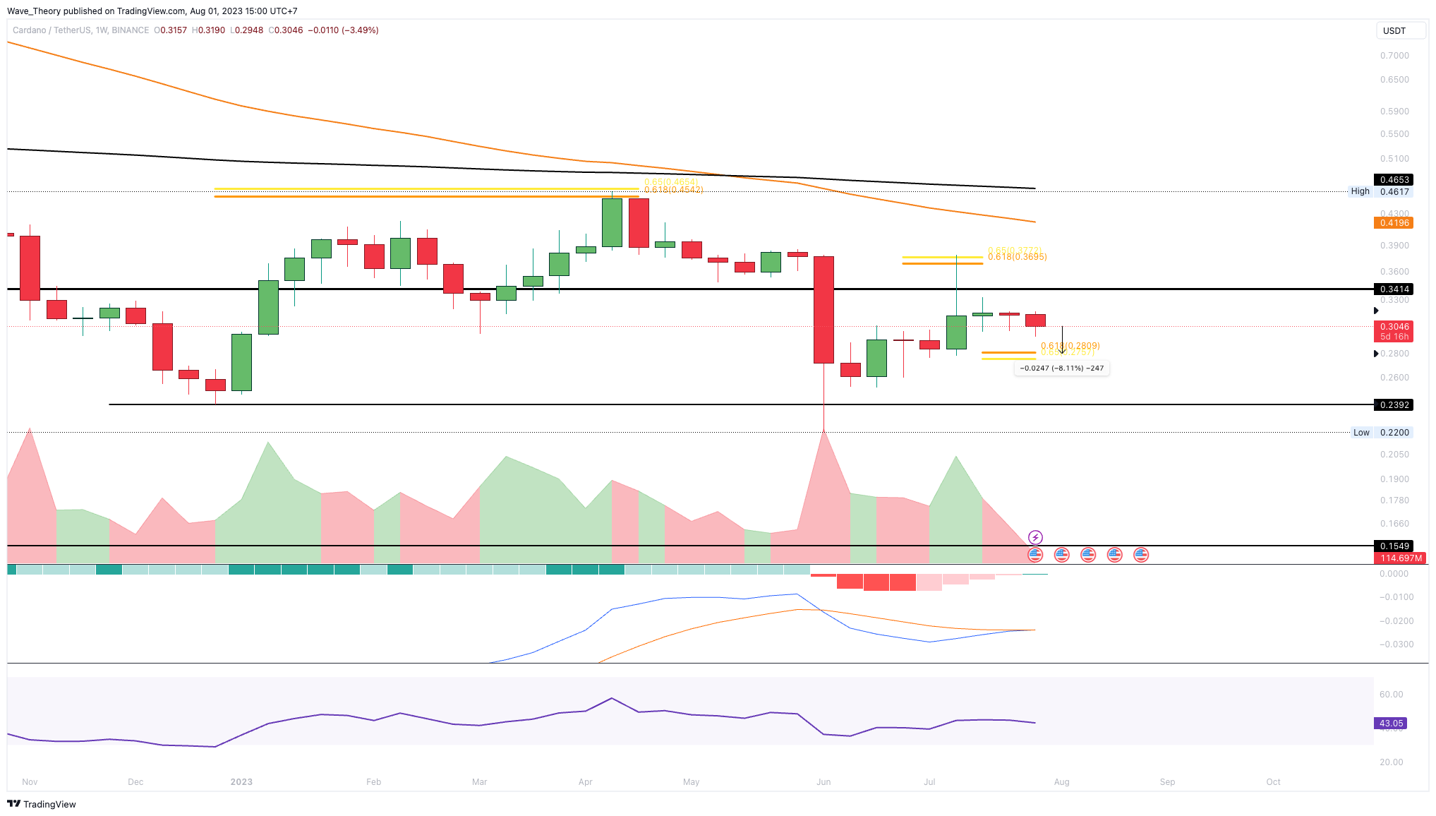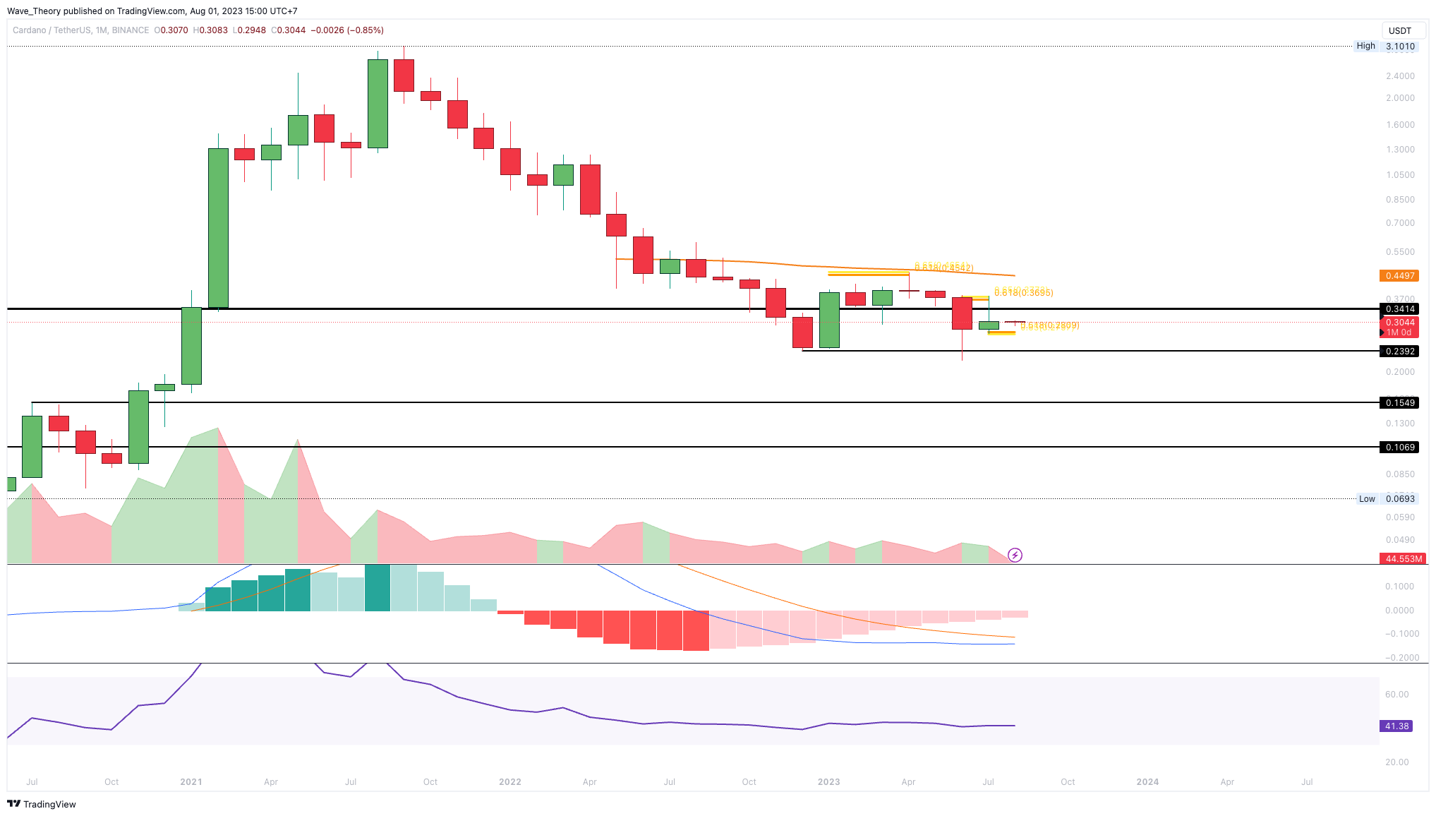 Doch die Abweisung am Golden Ratio Widerstand und der Monatsschlusskurs unter der 0,382 Fib Unterstützung bestätigen den Trend bärisch. Nach einer kurzen Aufwärtsbewegung wird der ADA Kurs womöglich den Abwärtstrend fortsetzen.
