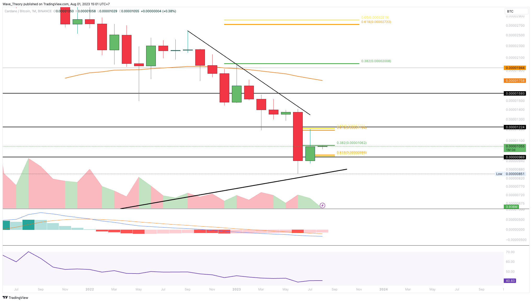 SponsoredGegen BTC hat der Cardano Kurs letzten Monat unter dem 0,382 Fib Niveau bei rund 0,00001062 BTC geschlossen
