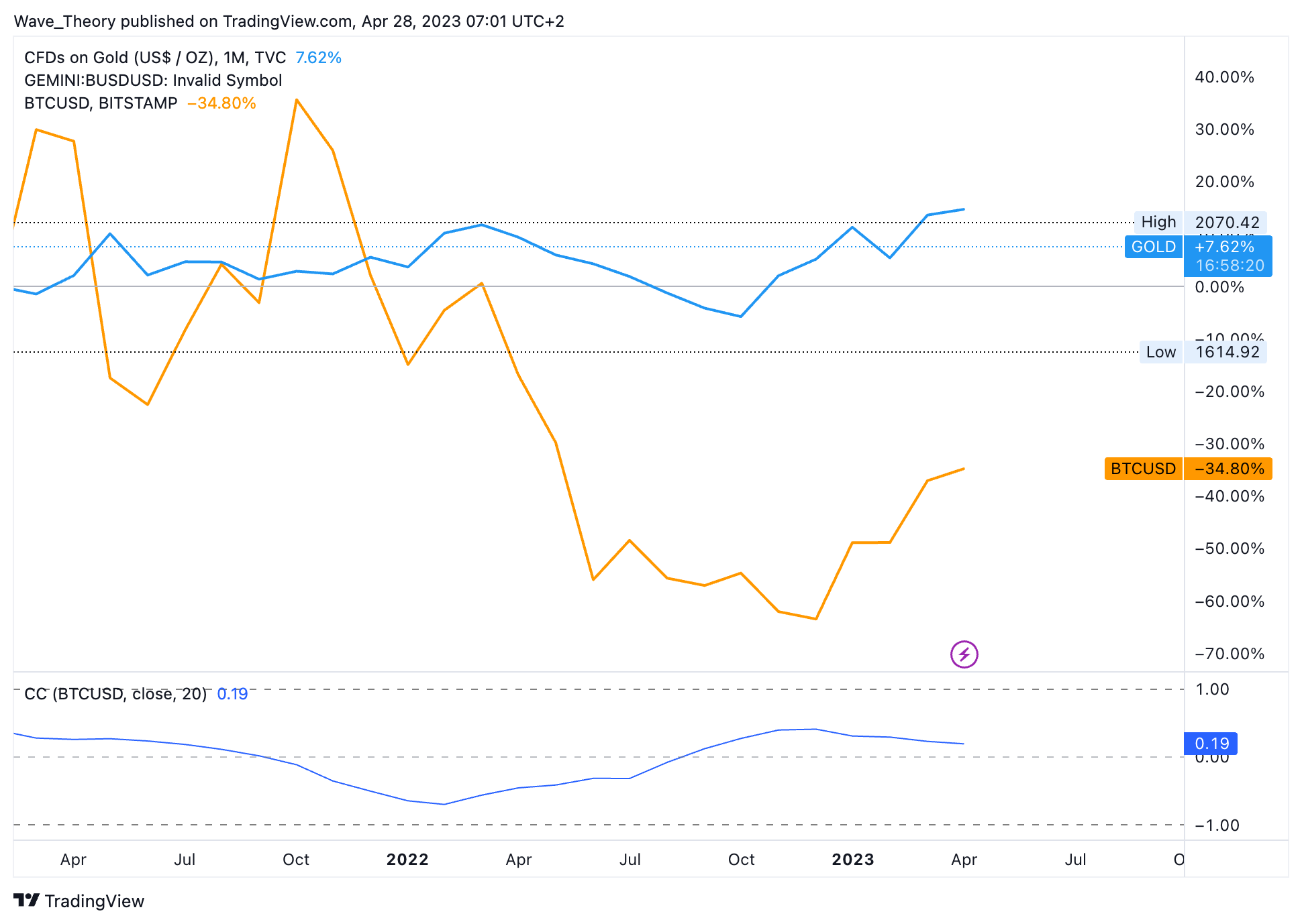 Derzeit liegt keine positive oder negative Korrelation zwischen dem Bitcoin und Gold Kurs vor. Jedoch verlief sowohl für Gold als auch BTC das neue Jahr bisher eindeutig bullisch. Mit einem positiven Korrelationswert von 0.19 ist diese Ähnlichkeit aber nur Zufall.
